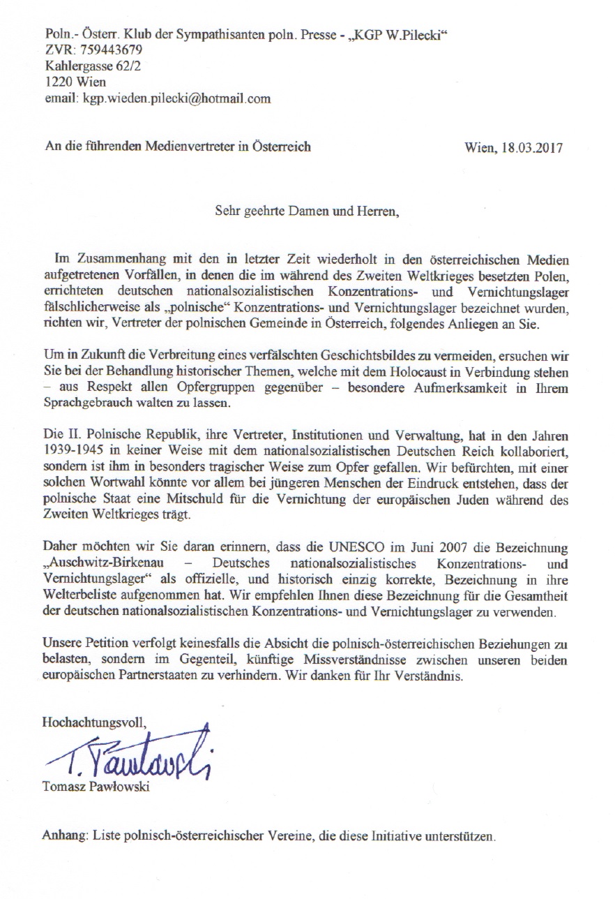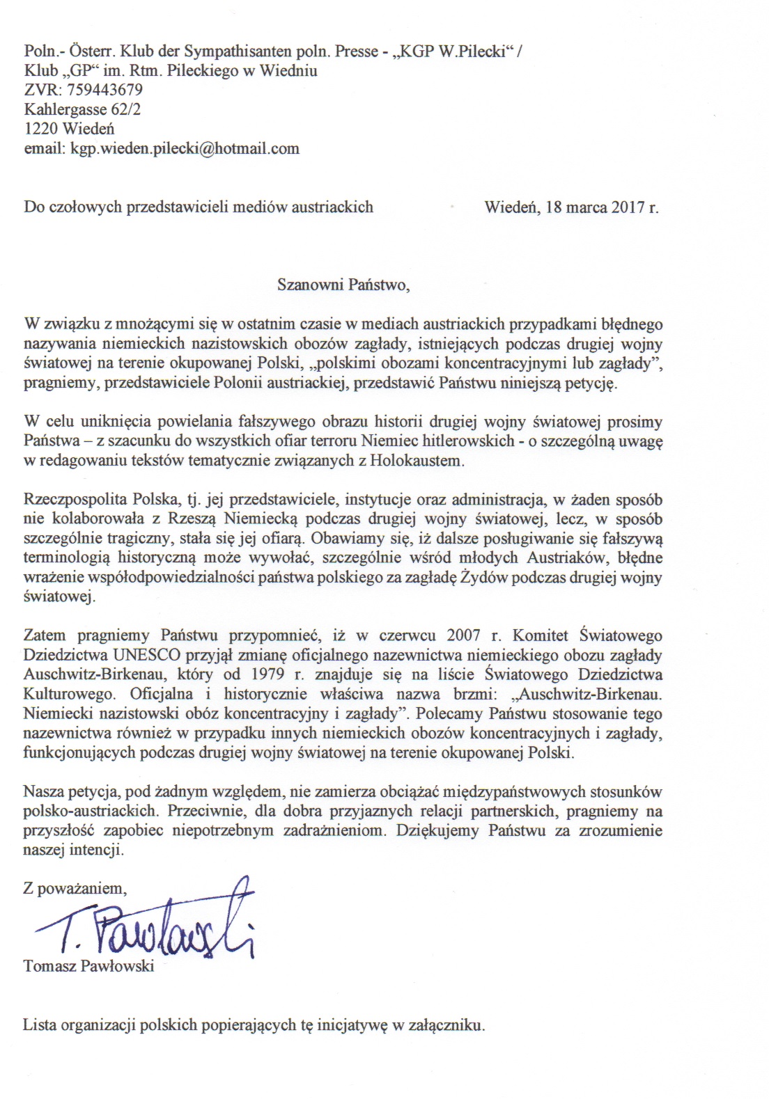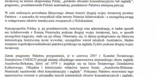 – W związku z mnożącymi się w ostatnim czasie w austriackich mediach austriackich przypadkami błędnego nazywania niemieckich nazistowskich obozów zagłady, istniejących podczas drugiej wojny światowej na terenie okupowanej Polski, „polskimi obozami koncentracyjnymi lub zagłady”, pragniemy, przedstawiciele Polonii austriackiej, przedstawić Państwu niniejszą petycję. – czytamy w liście.