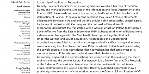 „Prezydent Władimir Putin, a także Wiaczesław Wołodin, przewodniczący Dumy Państwowej oraz Maria Zacharowa, dyrektor Departamentu Informacji i Prasy w rosyjskim MSZ fałszywie skomentowali fakty historyczne i zniesławili Polskę. Kilkukrotnie wydali fałszywe oświadczenia dotyczące antysemityzmu w Polsce, a także oskarżyli przedwojennego polskiego ambasadora, Józefa Lipskiego, o zmowę z Niemcami przed wybuchem II wojny światowej. Jest to oczywiste kłamstwo. Nie można zaprzeczyć, że wojna rozpoczęła się od niemieckiego ataku na Polskę, ale tuż po nim, 17 września 1939 r, ze wschodu nastąpiła następna ofensywa, ofensywa radziecka. Późniejszy podział Polski wzdłuż linii demarkacyjnej uzgodnionej w pakcie Ribbentrop – Mołotow potwierdza ten fakt”