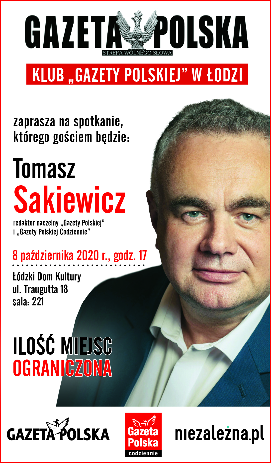 ŁÓDŹ | Zaproszenie na spotkanie z red. Tomaszem Sakiewiczem 8 października godz. 17:00 Klub Gazety Polskiej w Łodzi zaprasza na spotkanie z redaktorem Tomaszem Sakiewiczem. 8 października godzina 17:00. Łódzki Dom Kultury ul. Traugutta 18 sala 221. W związku z sytuacją epidemiologiczną ilość miejsc ograniczona! paź 6, 2020 Kluby GP Łódź, Łuków Tagged Łódź Wstecz GPC | Polacy znów mogą przesądzić o zwycięstwie Trumpa Dalej TYDZIEŃ W KLUBACH „GP” | 75. rocznica powstania Narodowych Sił Zbrojnych