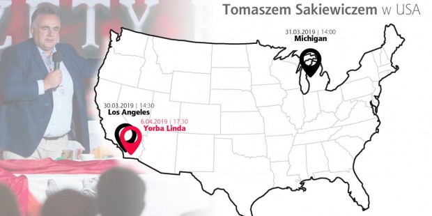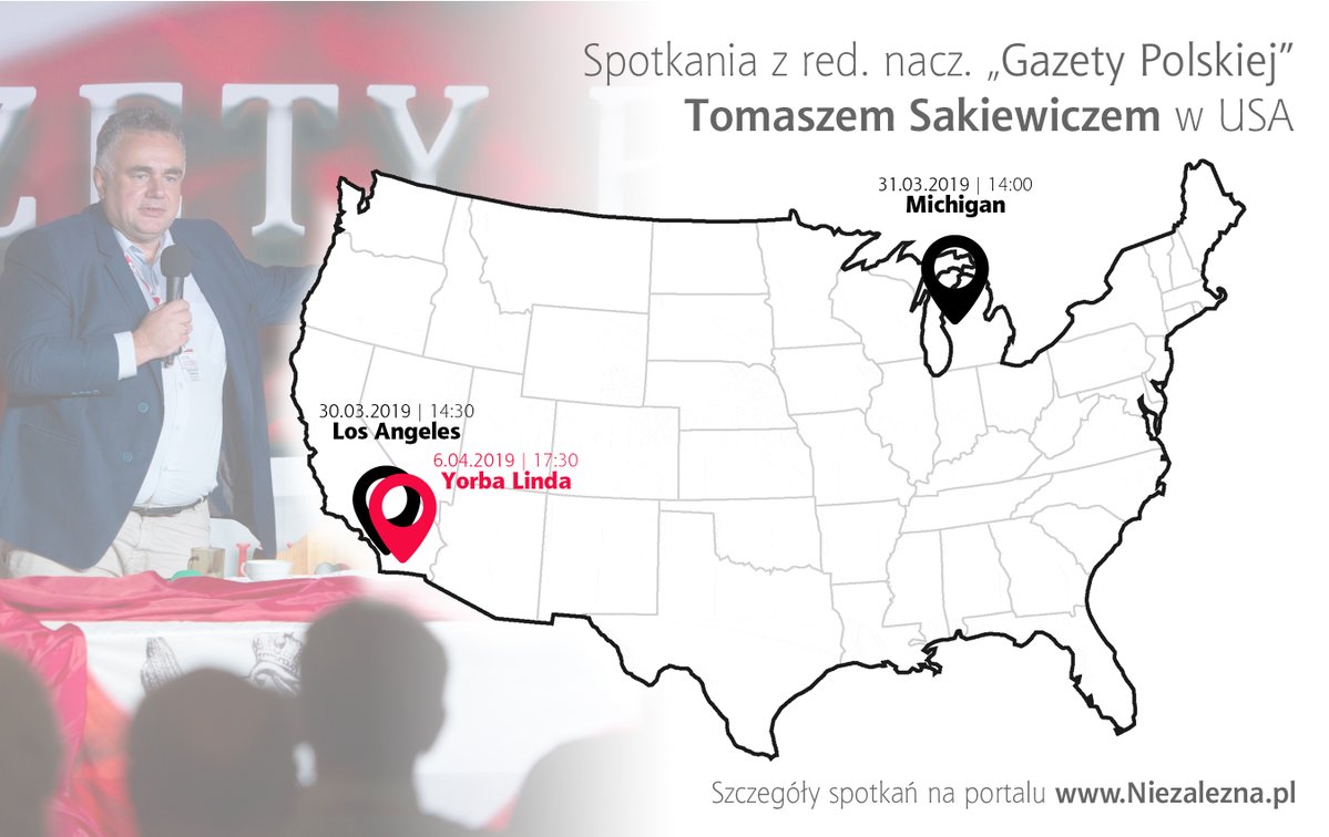 W soboty 30 marca oraz 6 kwietnia oraz w niedzielę 31 marca odbędą się w Stanach Zjednoczonych spotkania z Tomaszem Sakiewiczem, redaktorem naczelnym „Gazety Polskiej”. Pierwsze z nich w Los Angeles, kolejne w Michigan i Yorba Linda.