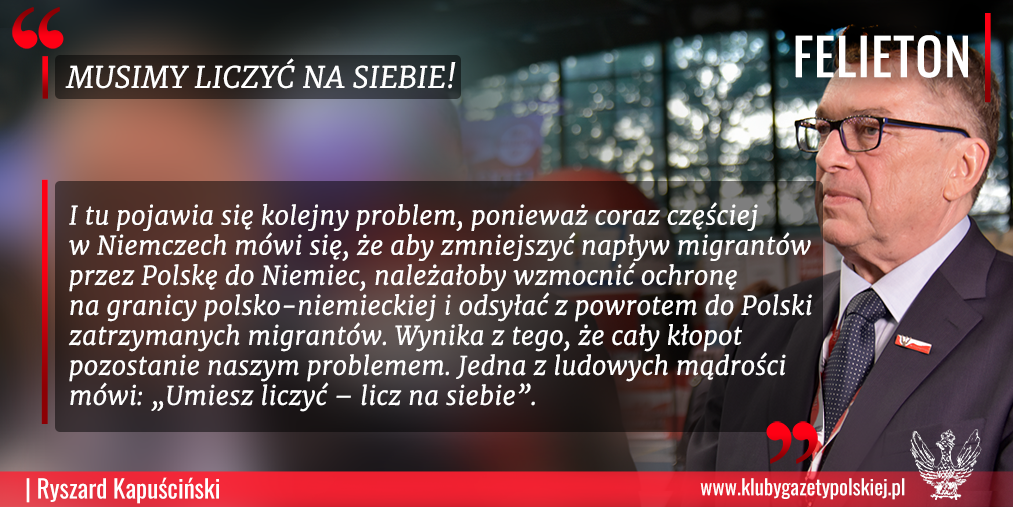 Na ostatnim spotkaniu szefów państw i rządów w Brukseli UE odmówiła sfinansowania muru na granicy Polski z Białorusią, a przewodnicząca KE Ursula von der Leyen stwierdziła kategorycznie, że „UE nie da pieniędzy na mury i drut kolczasty”. Czyli na nic apel 12 krajów (w tym Polski) do UE o pomoc w budowie zapory na granicy Polski z Białorusią. To niejedyna zła informacja, która może zaniepokoić Polaków. Jak informuje niemiecka policja, tylko w październiku odnotowano 5285 nielegalnych wjazdów migrantów przybyłych z Białorusi, podczas gdy w pierwszym półroczu 2021 r. przez granicę z Polską przedostało się do Niemiec w sposób nielegalny tylko 26 osób. Dziennik „Die Welt” sugeruje: „To wynika prawdopodobnie z tego, że nie wszyscy migranci są zatrzymywani na rozległym obszarze leśnym między Polską a Białorusią”. I tu pojawia się kolejny problem, ponieważ coraz częściej w Niemczech mówi się, że aby zmniejszyć napływ migrantów przez Polskę do Niemiec, należałoby wzmocnić ochronę na granicy polsko-niemieckiej i odsyłać z powrotem do Polski zatrzymanych migrantów. Wynika z tego, że cały kłopot pozostanie naszym problemem. Jedna z ludowych mądrości mówi: „Umiesz liczyć – licz na siebie”.