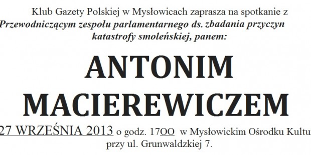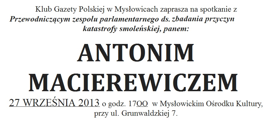 Mysłowice – spotkanie z Antonim Macierewiczem, przewodniczącym zespołu parlamentarnego ds. zbadania przyczyn katastrofy smoleńskiej, 27 września, g. 17 w Mysłowickim Ośrodku Kultury, przy ul. Grunwaldzkiej 7.