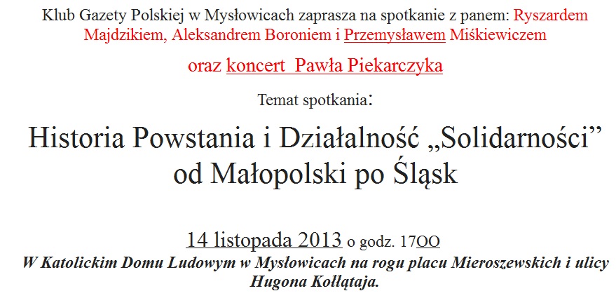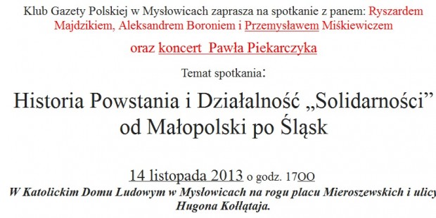 Mysłowice – spotkanie z panem: Ryszardem Majdzikiem, Aleksandrem Boroniem i Przemysławem Miśkiewiczem. Temat spotkania: Historia Powstania i Działalność „Solidarności” od Małopolski po Śląsk. 14 listopada, g. 17 w Katolickim Domu Ludowym.