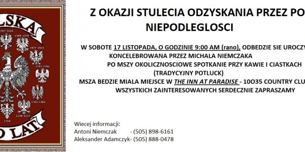 New Mexico (USA): Zaproszenie na Mszę Św.z okazji Stulecia Odzyskania przez Polskę Niepodległości NEW MEXICO (USA) – Uroczysta Msza Św. koncelebrowana przez Michała Niemczaka z okazji Stulecia Odzyskania przez Polskę Niepodległości. 17 listopada g. 19 am The Inn At Paradise – 10035 Country Club Line, NW. lis 13, 2018 Kluby GP New Mexico (USA) Tagged New Mexico (USA) Wstecz Kraków: Setna Rocznica Odzyskania Niepodległości.Krakowskie obchody. Dalej Poznań: Obchody 11 listopada w Warszawie
