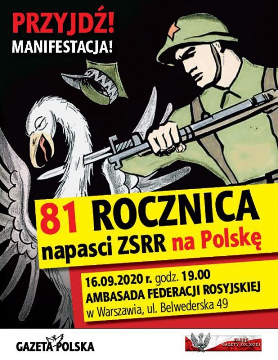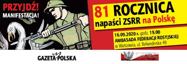 – Spotykamy się w wigilię rocznicy napaści Rosji Sowieckiej na Polskę. Tego dnia, 81 lat temu, wszyscy skupieni byli na walce z niemieckim agresorem, nikt nie spodziewał się zdradzieckiego ataku ze wschodu. Warto o tym pamiętać. Spotkajmy się, by powiedzieć „nie” rosyjskiemu imperializmowi i uczcić cichych bohaterów tej rocznicy. Bądźmy tego dnia razem – apelują organizatorzy manifestacji pod ambasadą Federacji Rosyjskiej w Warszawie – „Gazeta Polska” oraz warszawskie Kluby „Gazety Polskiej”.