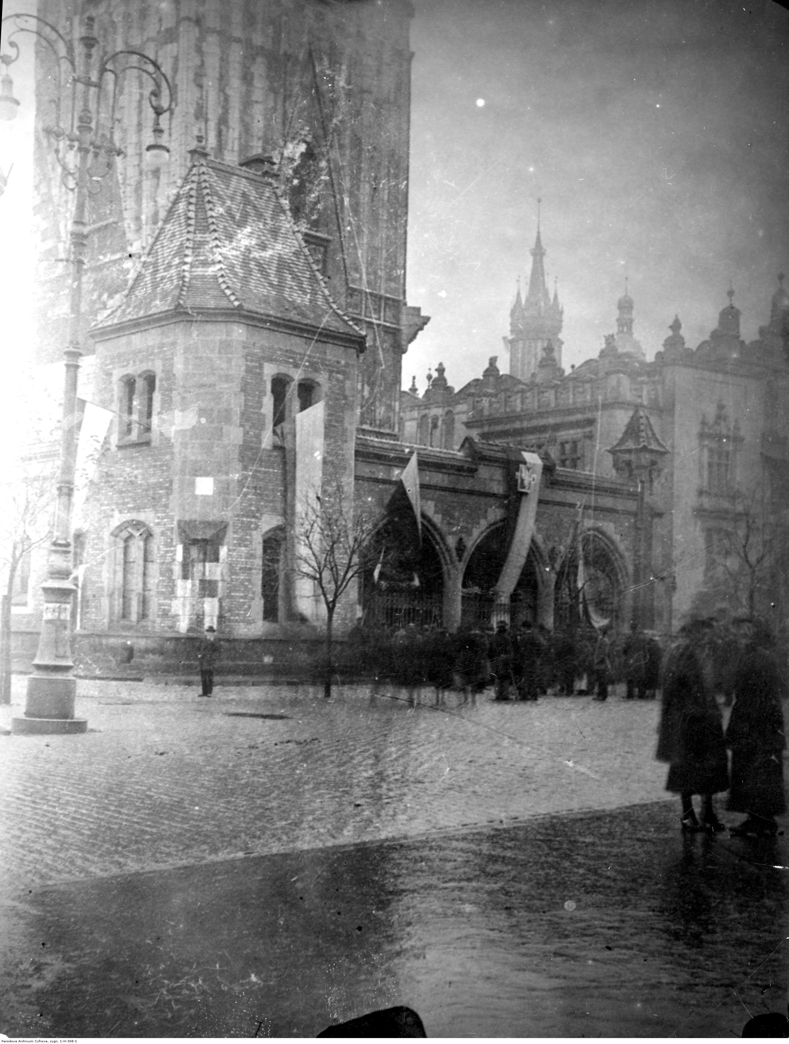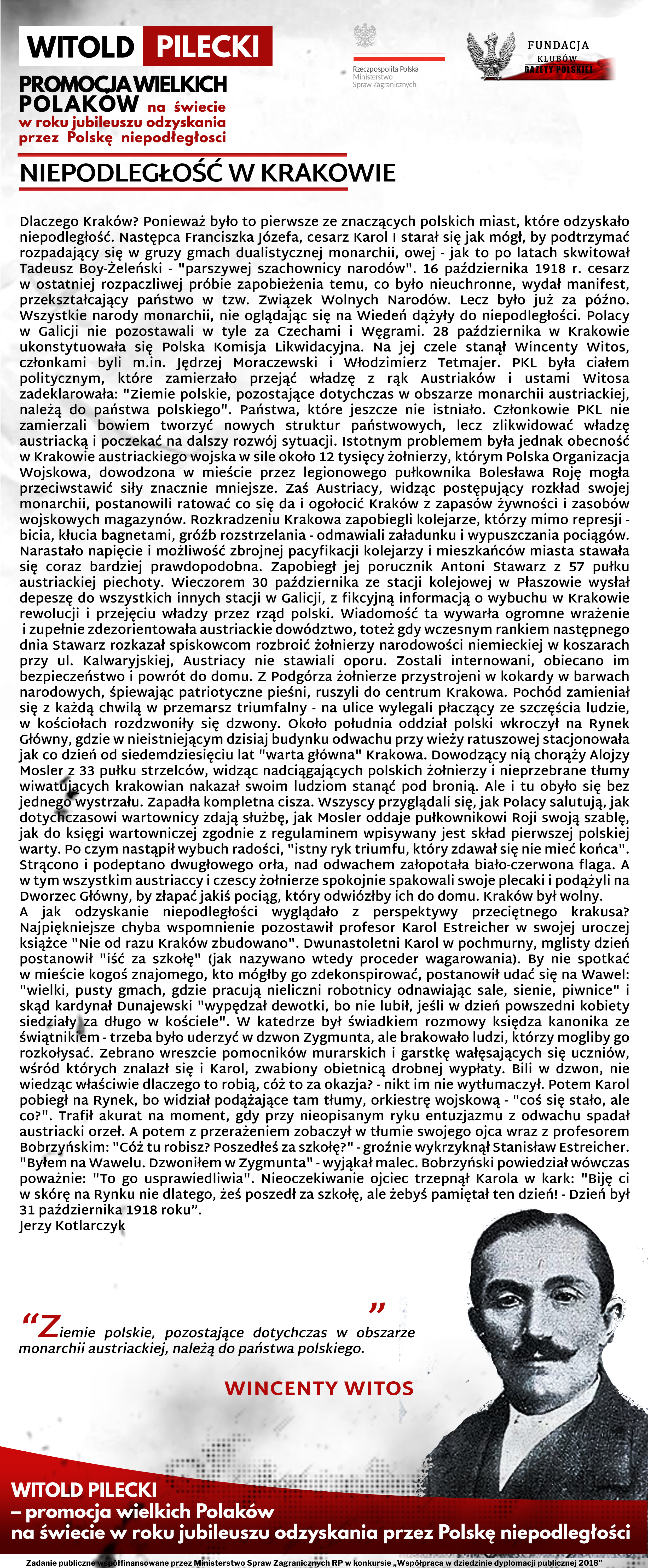 Dlaczego Kraków? Ponieważ było to pierwsze ze znaczących polskich miast, które odzyskało niepodległość. Następca Franciszka Józefa, cesarz Karol I starał się jak mógł, by podtrzymać rozpadający się w gruzy gmach dualistycznej monarchii, owej – jak to po latach skwitował Tadeusz Boy-Żeleński – „parszywej szachownicy narodów”. 16 października 1918 r. cesarz w ostatniej rozpaczliwej próbie zapobieżenia temu, co było nieuchronne, wydał manifest, przekształcający państwo w tzw. Związek Wolnych Narodów. Lecz było już za późno. Wszystkie narody monarchii, nie oglądając się na Wiedeń dążyły do niepodległości. Polacy w Galicji nie pozostawali w tyle za Czechami i Węgrami. 28 października w Krakowie ukonstytuowała się Polska Komisja Likwidacyjna. Na jej czele stanął Wincenty Witos, członkami byli m.in. Jędrzej Moraczewski i Włodzimierz Tetmajer. PKL była ciałem politycznym, które zamierzało przejąć władzę z rąk Austriaków i ustami Witosa zadeklarowała: „Ziemie polskie, pozostające dotychczas w obszarze monarchii austriackiej, należą do państwa polskiego”. Państwa, które jeszcze nie istniało. Członkowie PKL nie zamierzali bowiem tworzyć nowych struktur państwowych, lecz zlikwidować władzę austriacką i poczekać na dalszy rozwój sytuacji. Istotnym problemem była jednak obecność w Krakowie austriackiego wojska w sile około 12 tysięcy żołnierzy, którym Polska Organizacja Wojskowa, dowodzona w mieście przez legionowego pułkownika Bolesława Roję mogła przeciwstawić siły znacznie mniejsze. Zaś Austriacy, widząc postępujący rozkład swojej monarchii, postanowili ratować co się da i ogołocić Kraków z zapasów żywności i zasobów wojskowych magazynów. Rozkradzeniu Krakowa zapobiegli kolejarze, którzy mimo represji – bicia, kłucia bagnetami, gróźb rozstrzelania – odmawiali załadunku i wypuszczania pociągów. Narastało napięcie i możliwość zbrojnej pacyfikacji kolejarzy i mieszkańców miasta stawała się coraz bardziej prawdopodobna. Zapobiegł jej porucznik Antoni Stawarz z 57 pułku austriackiej piechoty. Wieczorem 30 października ze stacji kolejowej w Płaszowie wysłał depeszę do wszystkich innych stacji w Galicji, z fikcyjną informacją o wybuchu w Krakowie rewolucji i przejęciu władzy przez rząd polski. Wiadomość ta wywarła ogromne wrażenie i zupełnie zdezorientowała austriackie dowództwo, toteż gdy wczesnym rankiem następnego dnia Stawarz rozkazał spiskowcom rozbroić żołnierzy narodowości niemieckiej w koszarach przy ul. Kalwaryjskiej, Austriacy nie stawiali oporu. Zostali internowani, obiecano im bezpieczeństwo i powrót do domu. Z Podgórza żołnierze przystrojeni w kokardy w barwach narodowych, śpiewając patriotyczne pieśni, ruszyli do centrum Krakowa. Pochód zamieniał się z każdą chwilą w przemarsz triumfalny – na ulice wylegali płaczący ze szczęścia ludzie, w kościołach rozdzwoniły się dzwony. Około południa oddział polski wkroczył na Rynek Główny, gdzie w nieistniejącym dzisiaj budynku odwachu przy wieży ratuszowej stacjonowała jak co dzień od siedemdziesięciu lat „warta główna” Krakowa. Dowodzący nią chorąży Alojzy Mosler z 33 pułku strzelców, widząc nadciągających polskich żołnierzy i nieprzebrane tłumy wiwatujących krakowian nakazał swoim ludziom stanąć pod bronią. Ale i tu obyło się bez jednego wystrzału. Zapadła kompletna cisza. Wszyscy przyglądali się, jak Polacy salutują, jak dotychczasowi wartownicy zdają służbę, jak Mosler oddaje pułkownikowi Roji swoją szablę, jak do księgi wartowniczej zgodnie z regulaminem wpisywany jest skład pierwszej polskiej warty. Po czym nastąpił wybuch radości, „istny ryk triumfu, który zdawał się nie mieć końca”. Strącono i podeptano dwugłowego orła, nad odwachem załopotała biało-czerwona flaga. A w tym wszystkim austriaccy i czescy żołnierze spokojnie spakowali swoje plecaki i podążyli na Dworzec Główny, by złapać jakiś pociąg, który odwiózłby ich do domu. Kraków był wolny.