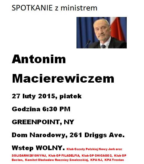 Nowy Jork – spotkanie z ministrem Antonim Macierewiczem, 27 lutego Zapraszamy na spotkanie z ministrem Antonim Macierewiczem organizowane przez Klub Gazety Polskiej w Nowym Jorku, które odbędzie się w piątek, 27 lutego o godzinie 6:30 popołudniu w Domu Narodowym na Greenpoincie, 261 Driggs Avenue. Wstęp wolny lut 24, 2015 Kluby GP Nowy Jork (USA) Tagged Antoni Macierewicz, Nowy Jork (USA) Wstecz Dziesięć podszeptów dla dra Andrzeja Dudy Dalej Kandydat na Prezydenta dr Andrzej Duda w Rypinie
