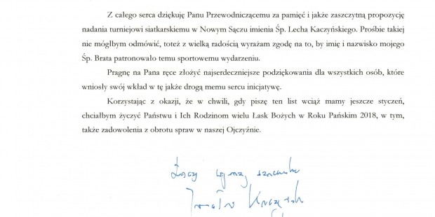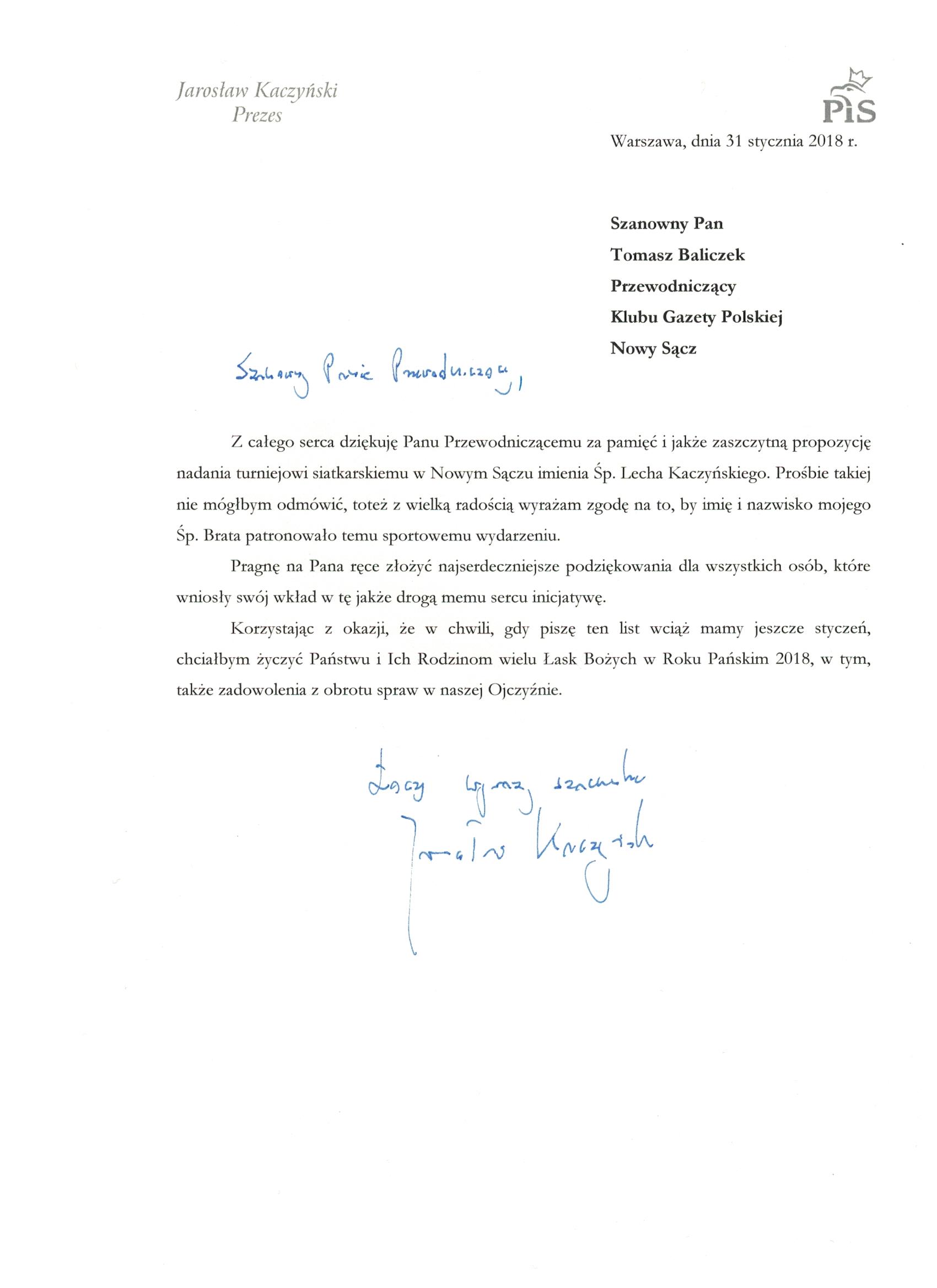 Nowy Sącz II: List od Prezesa Jarosława Kaczyńskiego – Turniej siatkarski imienia Śp. Prezydenta Prof. Lecha Kaczyńskiego Klub Gazety Polskiej otrzymał pismo Pana Prezesa Jarosława Kaczyńskiego dotyczące nadania Turniejowi imienia jego brata Śp. Lecha Kaczyńskiego Klub Gazety Polskiej Nowy Sącz II lut 22, 2018 Kluby GP Nowy Sącz II Tagged Nowy Sącz II Wstecz Dąbrowa Górnicza II: Zaproszenie – spotkanie ze Stanisławem Michalkiewiczem 2.02.2018 Dalej Gorzyce: Zaproszenie – Spotkanie z p. Bogusławem Kleszczyńskim oraz Msza Św. Dni Żołnierzy Wyklętych 4.03.2018