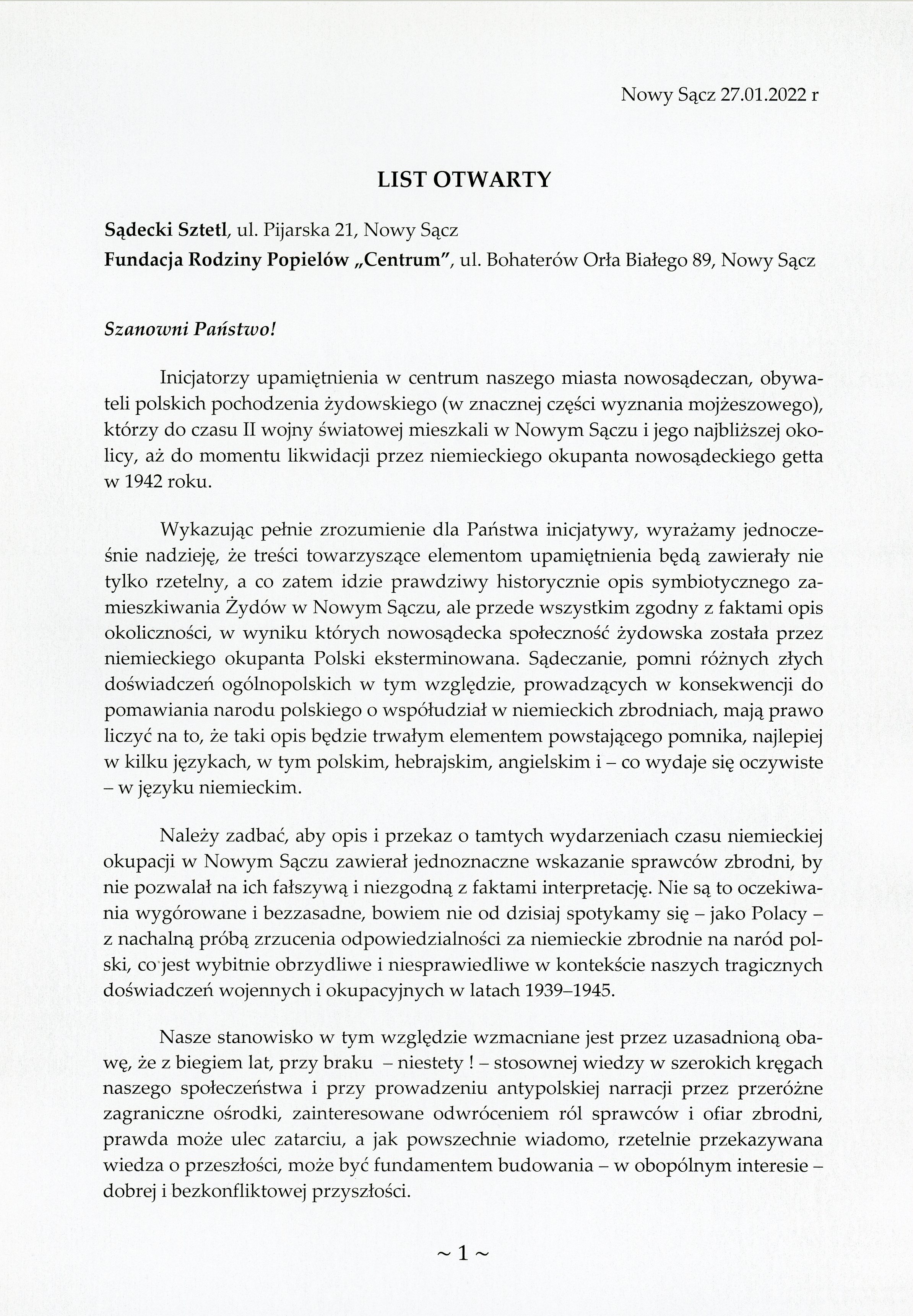 NOWY SĄCZ IM. J. OLSZEWSKIEGO | List otwarty w sprawie upamiętnienia sądeckich żydów List otwarty w sprawie upamiętnienia sądeckich żydów. Nowy Sącz 27.01.2022 roku. Sądecki Sztetl, Fundacja Rodziny Popielów „Centrum” cze 1, 2022 Kluby GP KlubyGP, Nowy Sącz im. Jana Olszewskiego Tagged Nowy Sącz im. Jana Olszewskiego Wstecz ELBLĄG II | ZAPROSZENIE na uroczystość posadzenia dębu „LECH” i odsłonięcie tablicy ku pamięci św. Pamięci Prezydenta LECHA KACZYŃSKIEGO Dalej Uzbrójmy się!