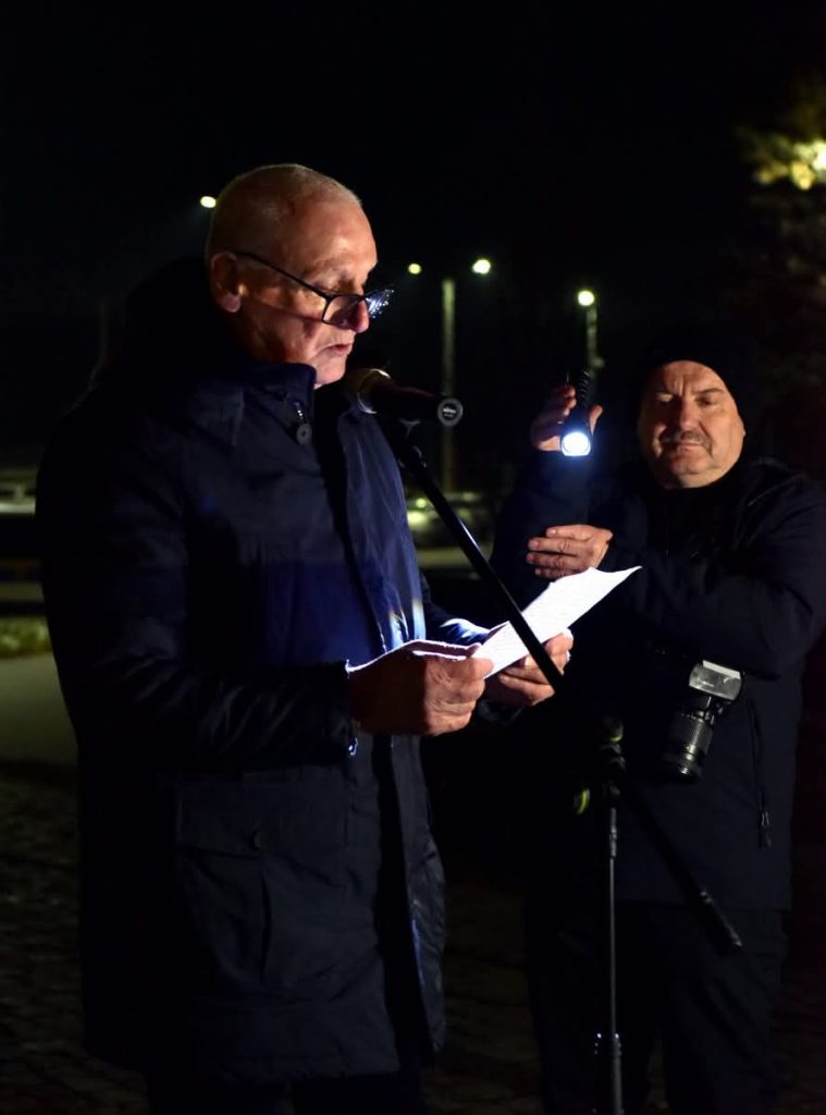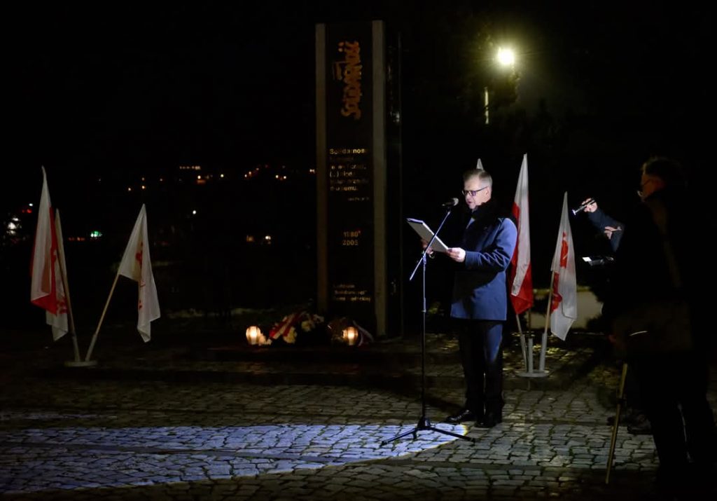 Po Mszy Świętej została poświęcona tablica kapelana Solidarności błogosławionego ks. Jerzego Popiełuszki zamordowanego bestialsko przez komunistów w 1984r. Następnie uczestnicy uroczystości wśród których były bardzo liczne w tym roku poczty sztandarowe, przemaszerowali pod pomnik NSZZ „Solidarności” przy Moście 700-lecia Nowego Sącza, gdzie tradycyjnie obyła się kolejna część uroczystości, którą prowadził przewodniczący Solidarności Krzysztof Kotowicz. Głos zabrał również ANDRZEJ SZKARADEK legenda sądeckiej „Solidarności”, internowany w stanie wojennym, wiezień polityczny PRL w latach 80. XX wieku, inwigilowany i prześladowany przez zbrodniczą peerelowską bezpiekę.Andrzej Szkaradek wyjątkowo, jak sam zaznaczył, nie wspomniał tym razem stanu wojennego i jego ofiar, ale odniósł się w swoim wystąpieniu do tragicznej sytuacji społeczno-politcznej, w której znalazła się Polska po roku rządów „koalicji 13 grudnia” pod przewodnictwem Donalda Tuska. Przemówienie Andrzeja Szkaradka przytaczamy w całości, bo to przesłanie, które każdemu, komu los i przeszłość naszej Ojczyzny miłe, powinno zapaść głęboko w serce i skłonić do patriotycznej refleksji: