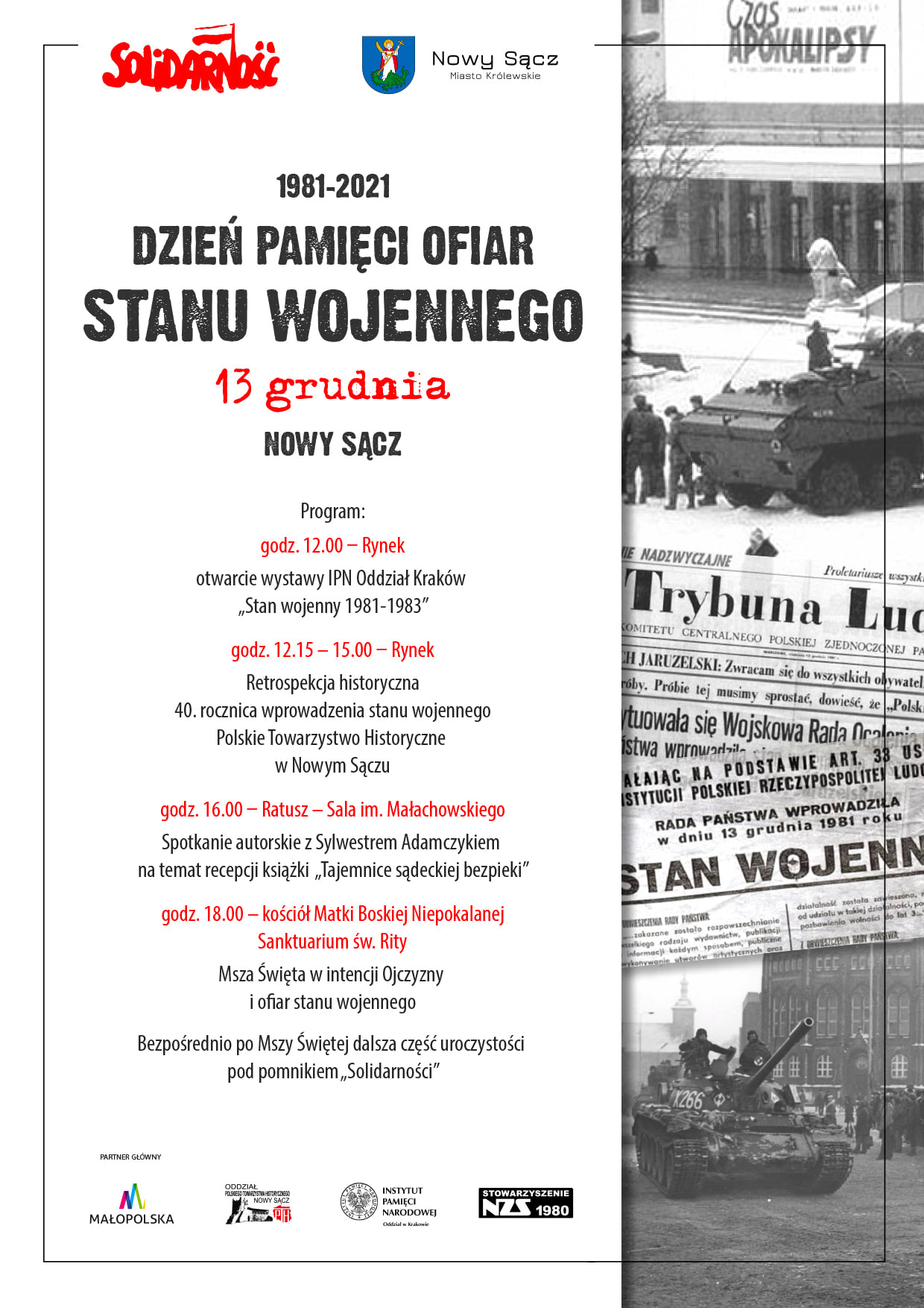 13 XII będziemy obchodzili 40 rocznicę wprowadzenia Stanu Wojennego przez komunistycznych zbrodniarzy. Z tej okazji w Nowym Sączu odbędą się obchody zorganizowane przez miasto Nowy Sącz, NSZZ Solidarność, IPN oddział w Krakowie, PTH oddział w Nowym Sączu, oraz województwo małopolskie.