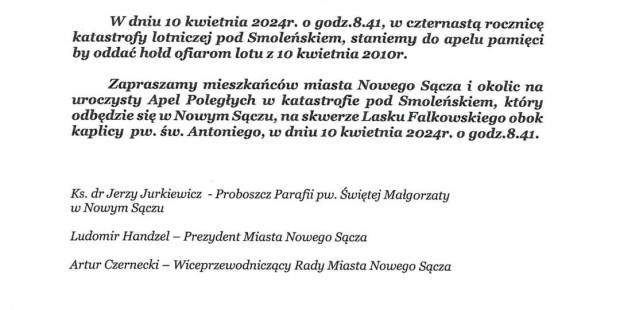 Nowy Sącz im. Jana Olszewskiego | ZAPROSZENIE 10.04 – 14. Rocznica katastrofy Smoleńskiej Rocznica katastrofy Smoleńskiej w Nowym Sączu odbędzie się w Lesie Falkowskim 10 kwietnia początek godzina 8.41 SZCZEGÓŁOWY PLAN UROCZYSTOŚCI PONIŻEJ kw. 9, 2024 Kluby GP KlubyGP, Nowy Sącz im. Jana Olszewskiego Tagged Kluby GP, Nowy Sącz im. Jana Olszewskiego, Tragedia Smoleńska Wstecz OPOLE | ZAPROSZENIE – 10.04 uroczystości w dniu 10 kwietnia 2024 r. w Kostowie Dalej KRAKÓW | ZAPROSZENIE 10.04, godz. 17.30 – XIV rocznica Tragedii Smoleńskiej,