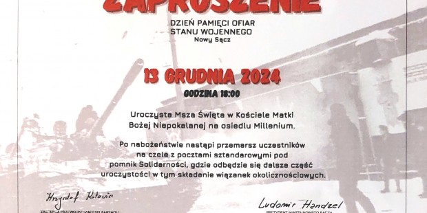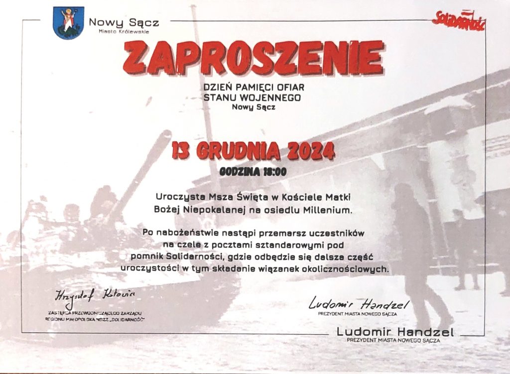 Nowy Sącz im. Jana Olszewskiego | Zaproszenie na obchody 13 XII Zaproszenie na obchody Dnia Pamięci Ofiar Stanu Wojennego 13 grudniagodz. 18:00Kościół Matki Bożej Niepokalanej na osiedlu Millenium gru 9, 2024 Kluby GP Nowy Sącz im. Jana Olszewskiego Tagged Nowy Sącz im. Jana Olszewskiego Wstecz GŁOGÓW | Projekcja filmu „Błogosławiona” Dalej KONIN | ZAPROSZENIE 11.12 – Spotkanie z posłem Markiem Jakubiakiem