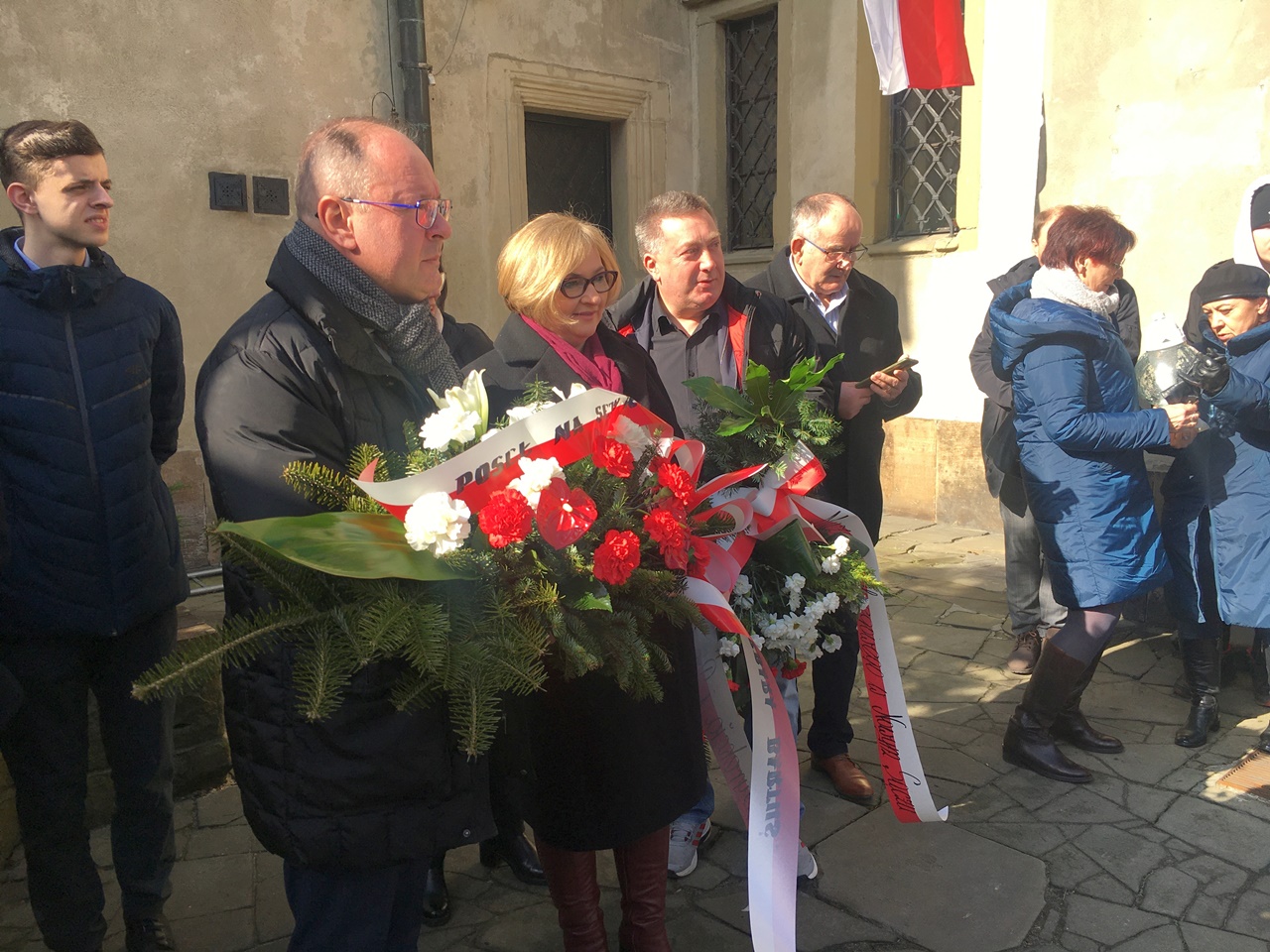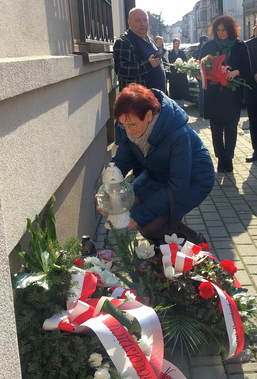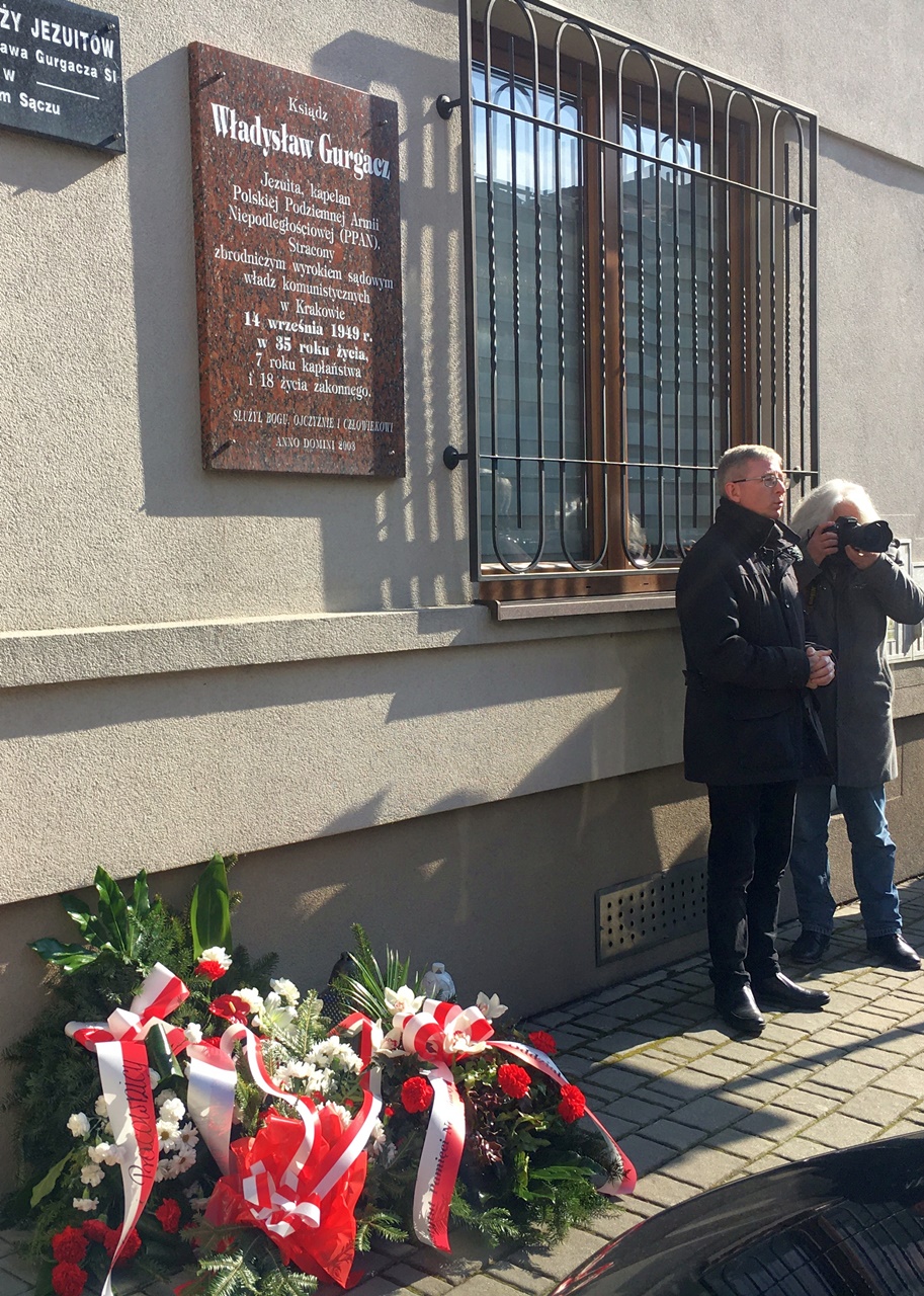 Po zakończeniu uroczystości otwarcia wystawy, wszyscy udali się pod, znajdującą się nieopodal na budynku Bursy Księży Jezuitów, tablicę poświęconą ks. Gurgaczowi, gdzie złożone zostały wiązanki kwiatów i zapalone znicze. Tak rozpoczęły się obchody Narodowego Dnia Pamięci Żołnierzy Wyklętych w Nowym Sączu.