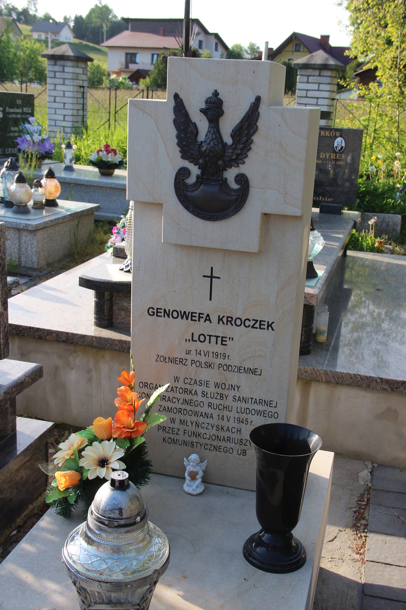 14 maja 1945 r. obława UB natrafiła na ukrywających się partyzantów. Podczas walki Kroczkówna została ranna. Strzałem w głowę dobił ją Tadeusz Lecyń, dawny towarzysz z oddziału „Bicza”, który przeszedł na stronę komunistów. Tego samego roku partyzanci poakowskiego podziemia wykonali na Lecyniu wyrok śmierci. 1 marca 2020 r. na cmentarzu parafialnym w Przyszowej skąd pochodziła Genowefa Kroczek „Lotte”, odsłonięto pomnik nagrobny ufundowany przez krakowski IPN.