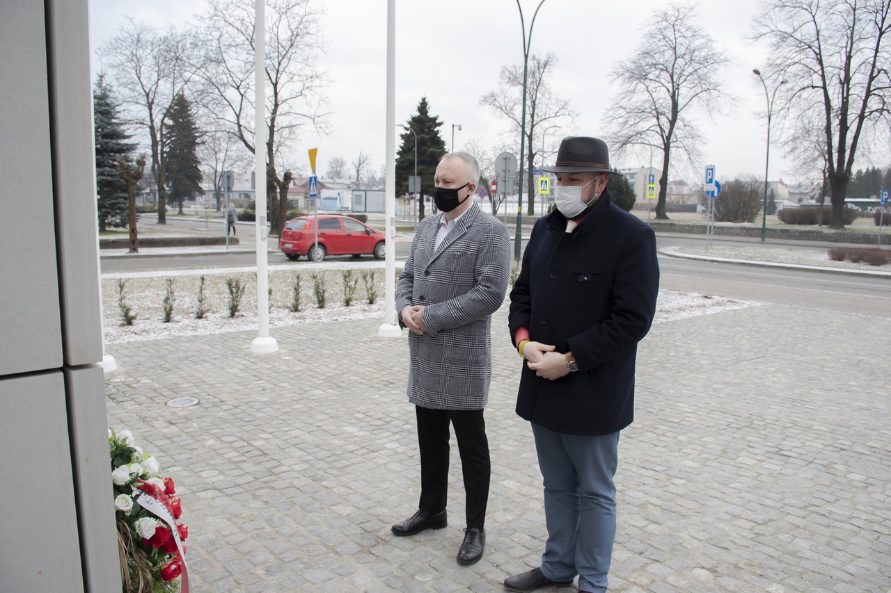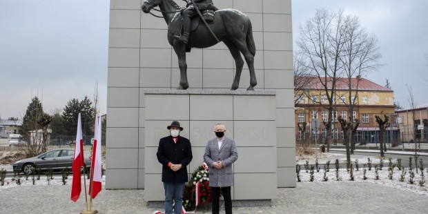 Przedstawiciel Klubu Gazety Polskiej Jarosław Jakubowski z Prezydentem Ludomirem Handzlem złożyli kwiaty pod pomnikiem Józefa Piłsudskiego Honorowego Mieszkańca Miasta.
