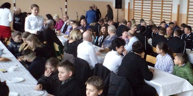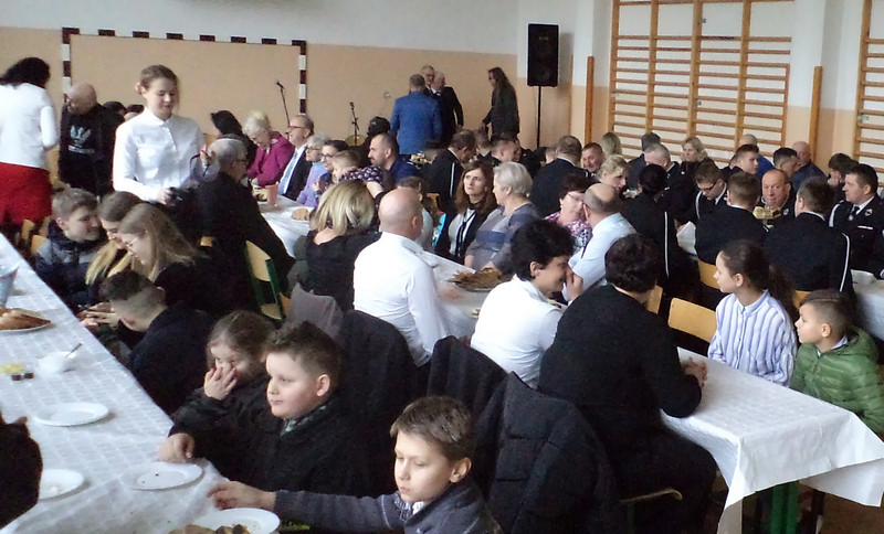 Po Mszy Św. wszyscy udali się do szkoły na poczęstunek. Panie z Koła Gospodyń Wiejskich ugościły nas wspaniałą grochówką z chlebem własnego wypieku i domowymi ciastami. Spotkanie uświetnili muzycy, dobrze nam znani z naszego przyjęcia opłatkowego, Tomasz Wolak i Jan Kłoskowski. Wykonali m.in. piosenkę „Biały krzyż” Krzysztofa Klenczona (jak podaje Wikipedia: „Krzysztof Klenczon skomponował „Biały krzyż” aby upamiętnić swego ojca, Czesława Klenczona, żołnierza Armii Krajowej i uczestnika polskiego podziemia antykomunistycznego w okresie powojennym. W 1945, gdy Krzysztof Klenczon miał trzy lata, Czesława Klenczona zatrzymał Urząd Bezpieczeństwa. Przez kolejnych 11 lat Czesław Klenczon ukrywał się na Pomorzu. Do rodziny powrócił jesienią 1956.”) i na specjalne zamówienie „Taki kraj” Jana Pietrzaka.