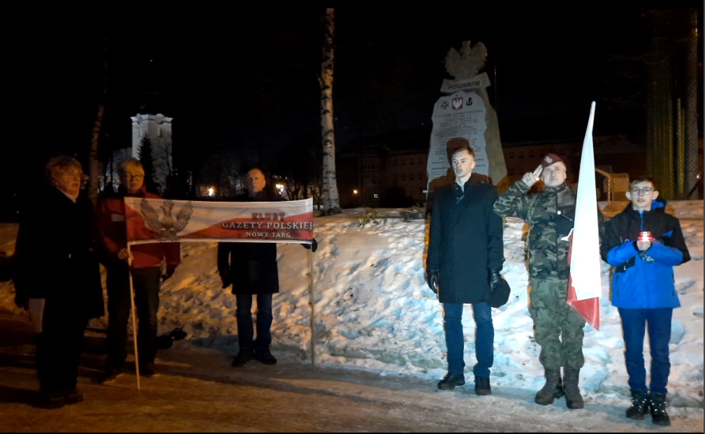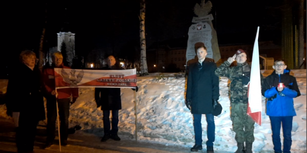 Złożono znicz pod pomnikiem bohaterów walki o ojczyznę w Nowym Targu w okolicy kopca niepodległości. Na zakończenie uroczystości skandowano hasła z manifestacji wolnych Polaków: „Ruda wron-a orła nie pokona” oraz „Zwyciężymy!”.