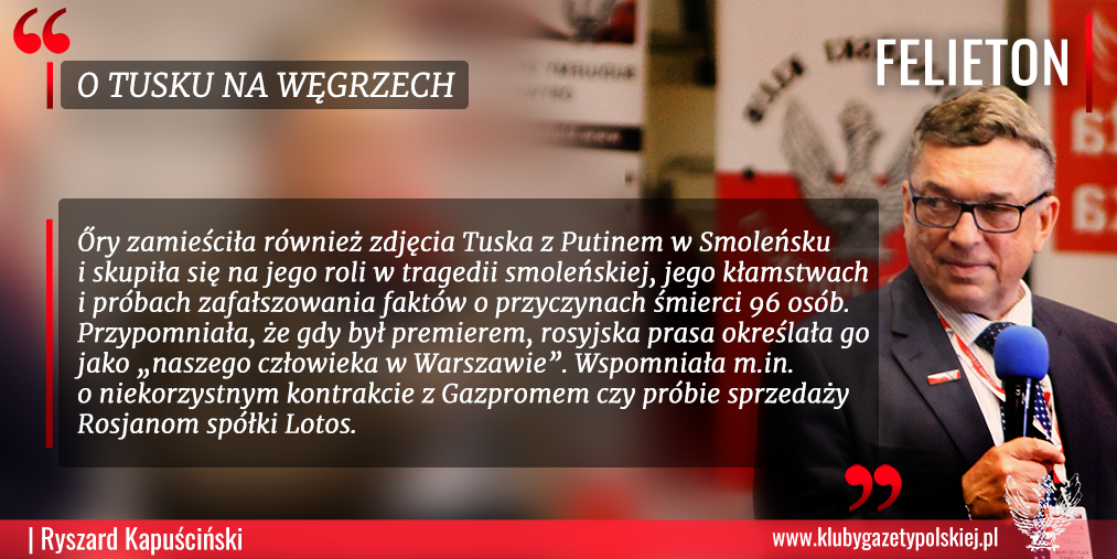 W piątkowym wydaniu węgierskiego dziennika „Magyar Hírlap” ukazał się obszerny tekst Marianny Őry: „Tusk i jego fałszywa krytyka Putina”. Już na wstępie dowiadujemy się, że Donald Tusk będzie gościem honorowym na imprezie lewicy 15 marca, o czym poinformował kandydat węgierskiej opozycji na premiera w kwietniowych wyborach parlamentarnych Péter Márki-Zay. Kontrkandydat Viktora Orbána reprezentuje koalicję partii socjalistycznych, ekologicznych, zielonych i Koalicji Demokratycznej (KD). Zwłaszcza obecność partii KD w koalicji tłumaczy zaproszenie Tuska do Budapesztu. Partię założył były premier Ferenc Gyurcsány, ten, który mówił: „Kłamaliśmy rano, nocą i wieczorem”, a jego była Węgierska Partia Socjalistyczna w 2011 r. została uznana przez Zgromadzenie Narodowe za organizację przestępczą. Őry zamieściła również zdjęcia Tuska z Putinem w Smoleńsku i skupiła się na jego roli w tragedii smoleńskiej, jego kłamstwach i próbach zafałszowania faktów o przyczynach śmierci 96 osób. Przypomniała, że gdy był premierem, rosyjska prasa określała go jako „naszego człowieka w Warszawie”. Wspomniała m.in. o niekorzystnym kontrakcie z Gazpromem czy próbie sprzedaży Rosjanom spółki Lotos.