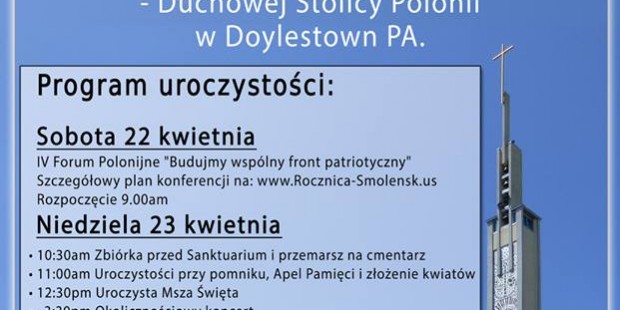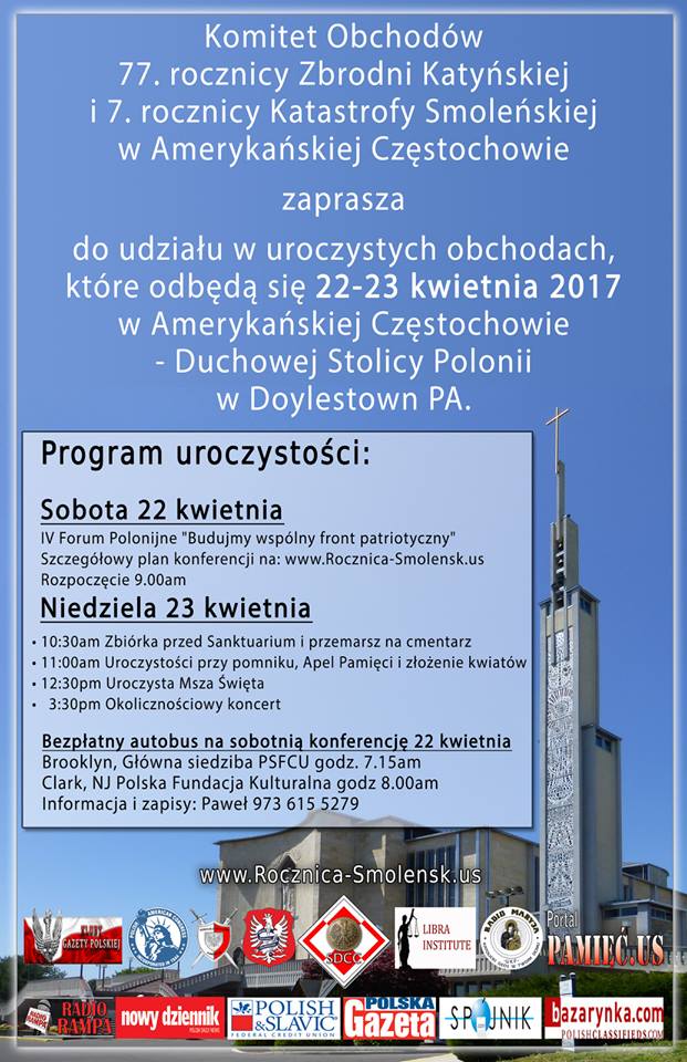 W zwiazku ze zbliżającą się 77. rocznicą Zbrodni Katyńskiej oraz 7. rocznicą katastrofy pod Smoleńskiem Komitet Obchodów Rocznicy Smoleńskiej zwraca się z gorącym Apelem do całej Polonii o wzięcie udziału w uroczystościach upamiętniających ofiary tych tragedii. Główne uroczystości z udziałem przedstawicieli rodzin katyńskich i smoleńskich, polskich parlamentarzystów, naukowców, przedstawicieli polskiej ambasady, lokalnej administracji oraz amerykańskich polityków odbędą się 23 kwietnia 2017 r. w Amerykańskiej Częstochowie w Doylestown, PA. Szczegółowe informacje na temat planu obchodów znajdują się tutaj