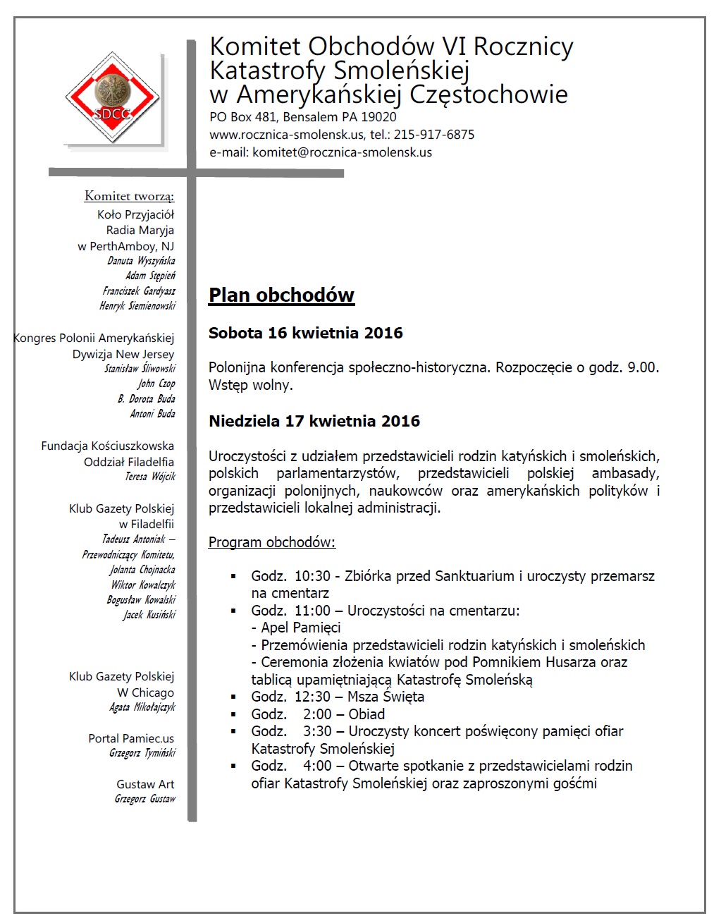 W niedzielę 17 kwietnia 2016 o godzinę 10:30 przemaszerujemy na cmentarz, gdzie o godz. 11:00 rozpoczną sie uroczystości upamiętniające ofiary obydwu tragedii. Następnie zostanie odprawiona uroczysta Msza Sw. o godz. 12:30. Po obiedzie (godz. 14:00), około godz. 15:30 przygotowana jest część artystyczna, w której udział wezmą między innymi: Marika Szczepek, chór „Angelus” z Nowego Jorku pod dyrekcja Izabeli Grajner-Partyka, Wojciech Hollender, Barbara Kotlarz., Ewa Tymińska oraz Paweł Piekarczyk.