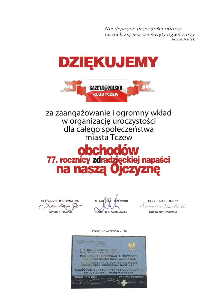 Inicjator spotkania, Stefan Kukowski (członek Klubu Gazety Polskiej) podziękował wszystkim za pomoc w organizowaniu, Instytutowi Pamięci Narodowej za wsparcie i patronat. Klubowi Gazety Polskiej z Tczewa za wielkie wsparcie organizacyjnie, rzeczowe i liczny udział. Starosta tczewski Tadeusz Dzwonkowski szczególnie zasłużonym wręczał specjalne podziękowania.