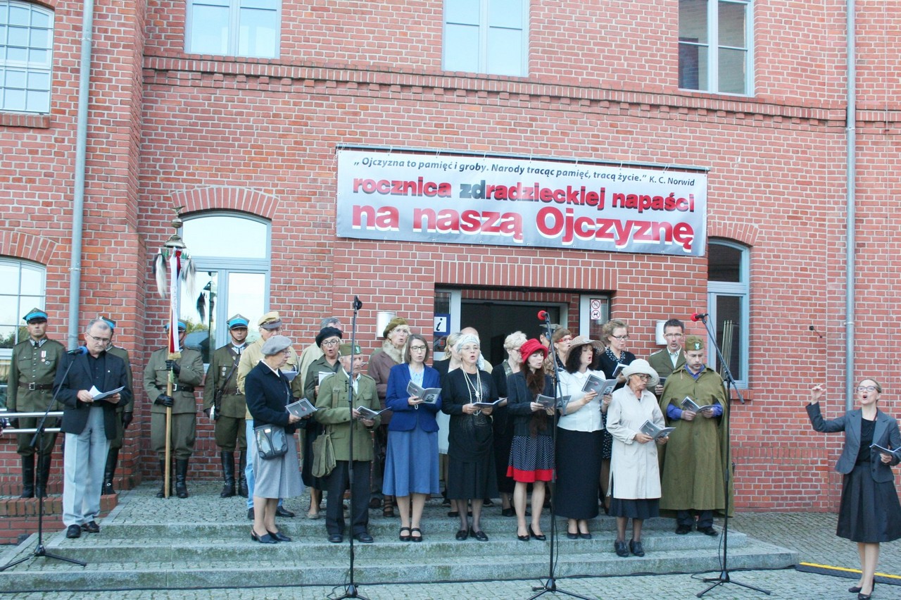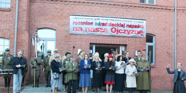 Po skończeniu składania kwiatów zebrani mieszkańcy przeszli na dziedziniec Fabryki Sztuk, gdzie było słychać głośne odgłosy wybuchów, syren. Grozy dopełniły jeszcze efekty dymów snujących się po dziedzińcu. inscenizują przygotowała grupa młodzieży z organizacji „Młodzież Wszechpolska”. Rozdawano także każdemu uczestnikowi śpiewniki z pieśniami patriotycznymi. Atmosferę wspólnoty śpiewu budowali chórzyści z chóru „Passionata” ubrani w stroje mody lat międzywojennych, harcerskich, partyzanckich.