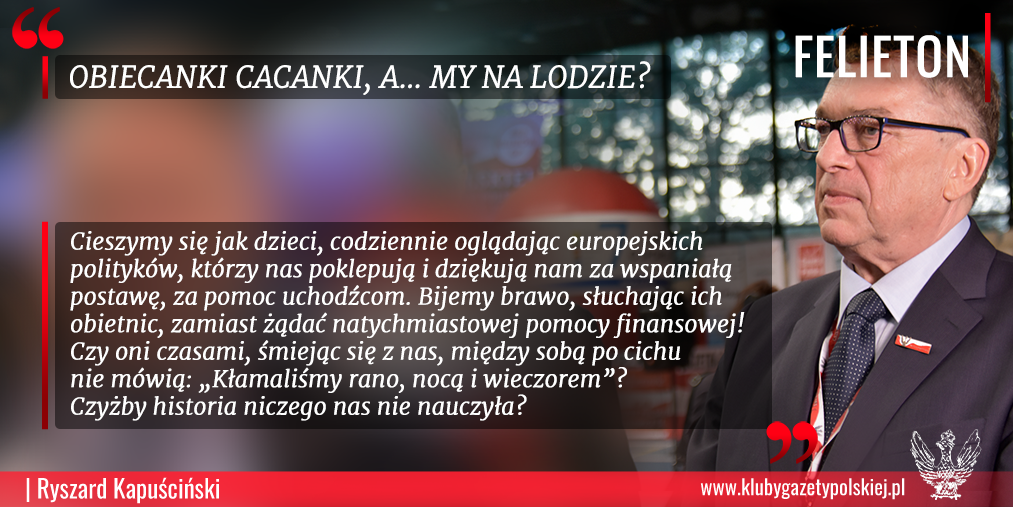 12 marca o godz. 14 na pl. Trzech Krzyży w Warszawie rozpocznie się manifestacja organizowana przez kluby „Gazety Polskiej” pod hasłem „Matki wołają: przestańcie strzelać do dzieci!”. Staniemy w obronie niewinnych dzieci mordowanych przez zbrodniarzy Putina. To kolejna manifestacja organizowana przez nasze środowisko. Dwa tygodnie temu zorganizowaliśmy Marsz Pokoju, w którym wzięły udział tysiące Polaków. To wszystko dzieje się niezależnie od pomocy, jakiej udzielamy ukraińskim dzieciom i ich matkom. Musimy zadać światu pytania, dlaczego w obliczu tragedii milionów ludzi na granicy nie widać takich organizacji, jak ONZ czy Czerwony Krzyż? Dlaczego nikt nie spieszy nam z pomocą finansową w obliczu olbrzymich kosztów, jakie ponosimy i będziemy ponosić, przyjmując miliony uchodźców. Cieszymy się jak dzieci, codziennie oglądając europejskich polityków, którzy nas poklepują i dziękują nam za wspaniałą postawę, za pomoc uchodźcom. Bijemy brawo, słuchając ich obietnic, zamiast żądać natychmiastowej pomocy finansowej! Czy oni czasami, śmiejąc się z nas, między sobą po cichu nie mówią: „Kłamaliśmy rano, nocą i wieczorem”? Czyżby historia niczego nas nie nauczyła?