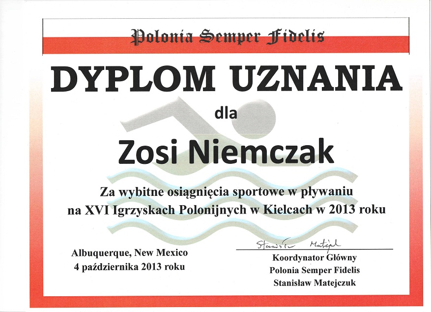 Chociaż od XVI Igrzysk Polonii w Kielcach minęło już kilka tygodni, to jednak zarówno Polonia Semper Fidelis jak i Klub Gazety Polskiej w stanie New Mexico postanowiły oficjalnie powitać naszą wielokrotną medalistkę i rekordzistkę w pływaniu Zosię Niemczak, o której w ciągu najbliższych lat na pewno usłyszymy jako o złotej medalistce olimpijskiej i – być może – o mistrzyni świata. Jesteśmy tym bardziej dumni z Zosi, bowiem na XVI Igrzyskach w Kielcach reprezentowała ona barwy Polonia Semper Fidelis, będąc zawodniczką z USA. Taki też transparent powiewał w ciagu następnych dni nad pływalnią, podczas których – wówczas 13-letnia – Zosia zdobywała kolejne złote medale Igrzysk.