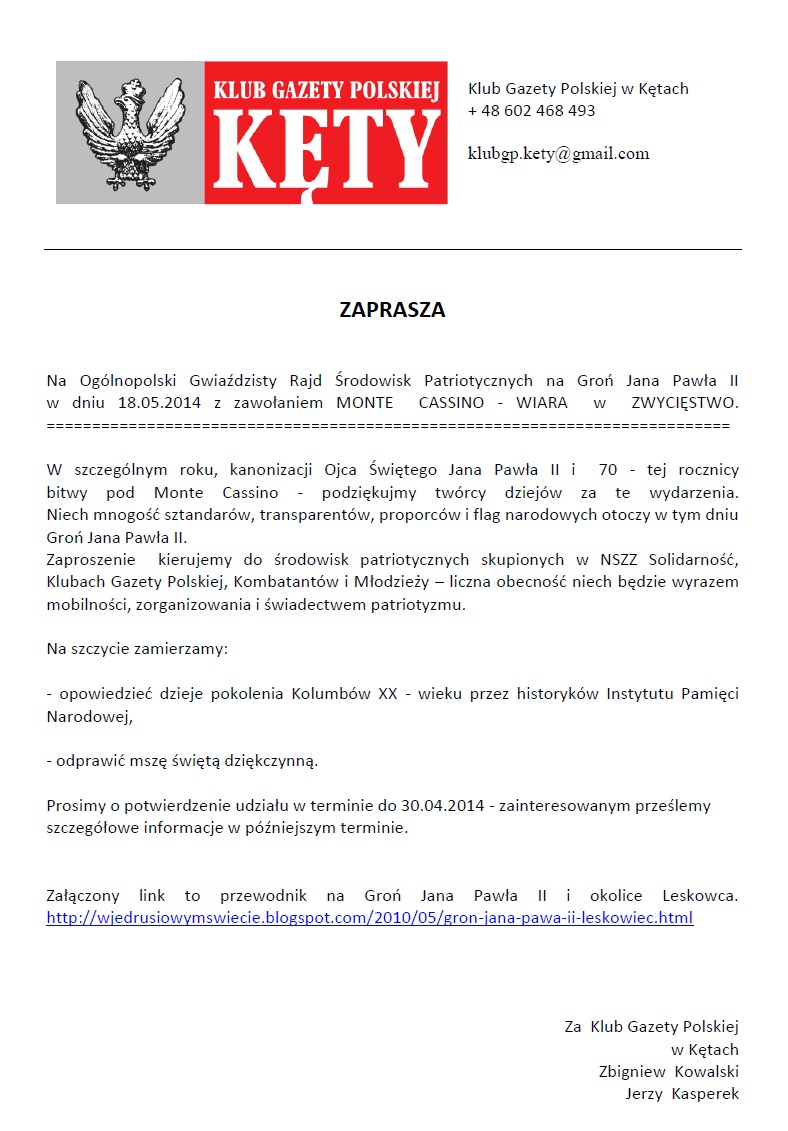 Ogólnopolski Gwiaździsty Rajd Środowisk Patriotycznych na Groń Jana Pawła II, 18 maja, godz. 11, z zawołaniem MONTE CASINO – WIARA w ZWYCIĘSTWO.
