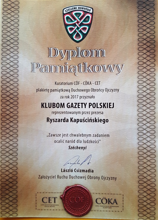 Klubom „Gazety Polskiej” przyznano nagrodę „Duchowego Obrońcy Ojczyzny”. Uroczystość wręczenia odznaczenia odbyła się w Budapeszcie. Fundacja Użyteczności Publicznej Współpracy Obywatelskiej (CÖKA) przyznaje nagrodę organizacjom, dla których priorytetem jest ochrona wartości narodowych. Nagrodę za 2017 rok wręczono prezesowi Ryszardowi Kapuścińskiemu.