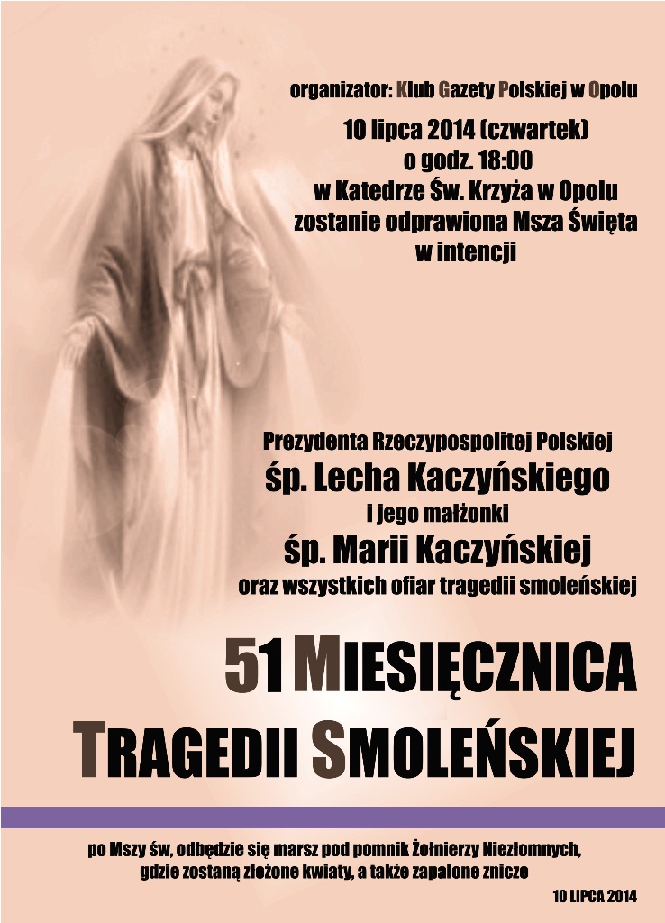 Opole – Msza św. w 51. Miesięcznicę Tragedii Smoleńskiej, 10 lipca Opole – Msza św. w 51. Miesięcznicę Tragedii Smoleńskiej, 10 lipca, g. 18, w Katedrze Św. Krzyża. Po Mszy św. odbędzie się marsz pod pomnik Żołnierzy Niezłomnych, gdzie zostaną złożone kwiaty a także zapalone znicze. lip 7, 2014 Kluby GP Opole Tagged Marsz, Miesięcznice, Obchody, Opole, Tragedia Smoleńska Wstecz Katowice – Manifestacja w obronie Polskości Śląska, 12 lipca Dalej Warka – Msza św. w intencji Ofiar tragedii smoleńskiej, 13 lipca