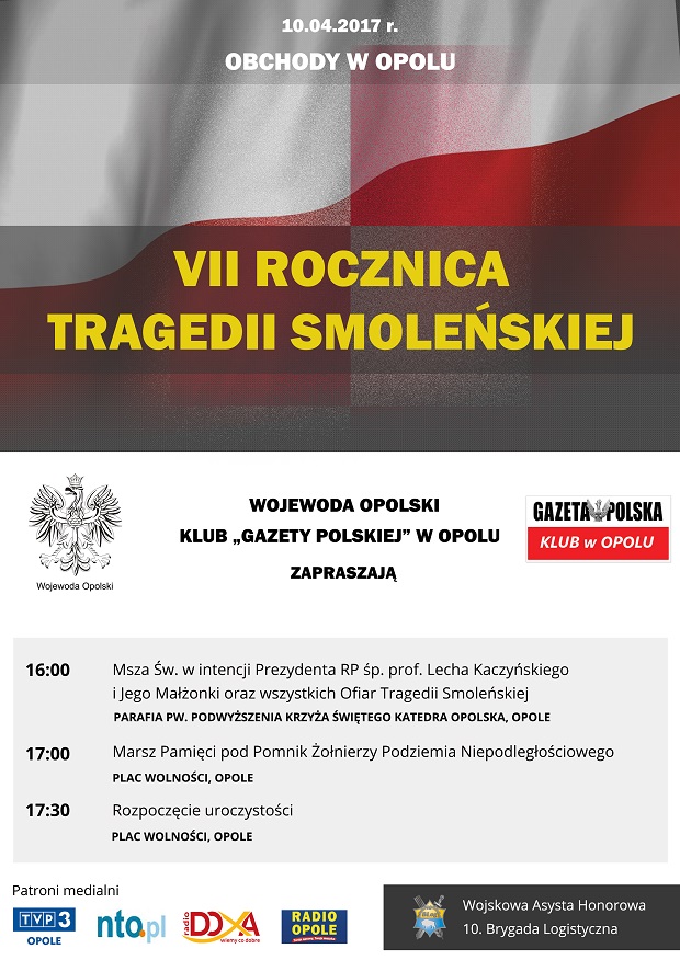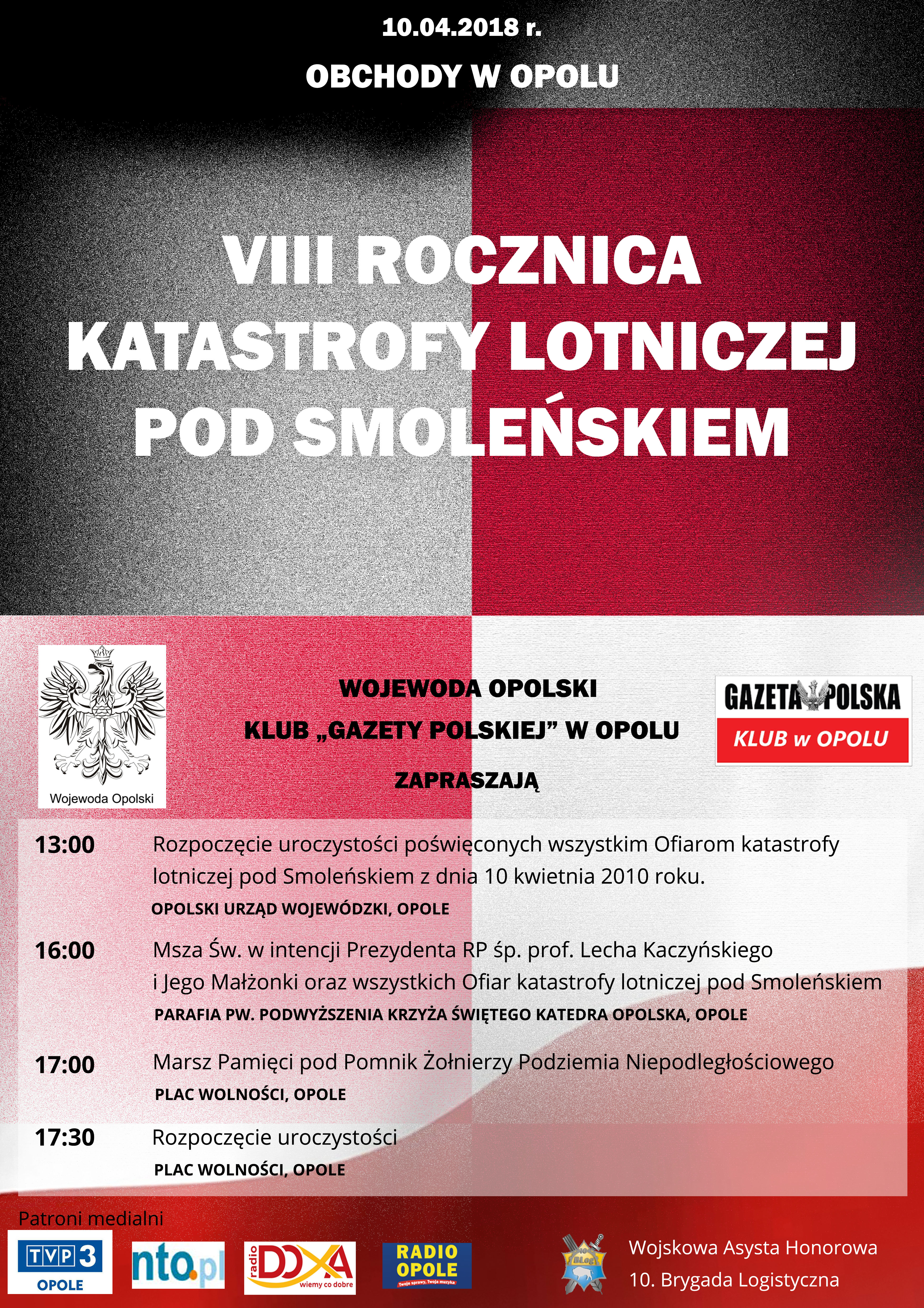 Opole – uroczystości VIII rocznicy tragedii smoleńskiej, 10 kwietnia, g. 16 Msza św. w intencji Ofiar w Parafii pw. Podwyższenia Krzyża Św., Katedra Opolska; g. 17 Marsz Pamięci pod Pomnik Żołnierzy Podziemia Niepodległościowego; g. 17.30 dalsze uroczystości, Plac Wolności.