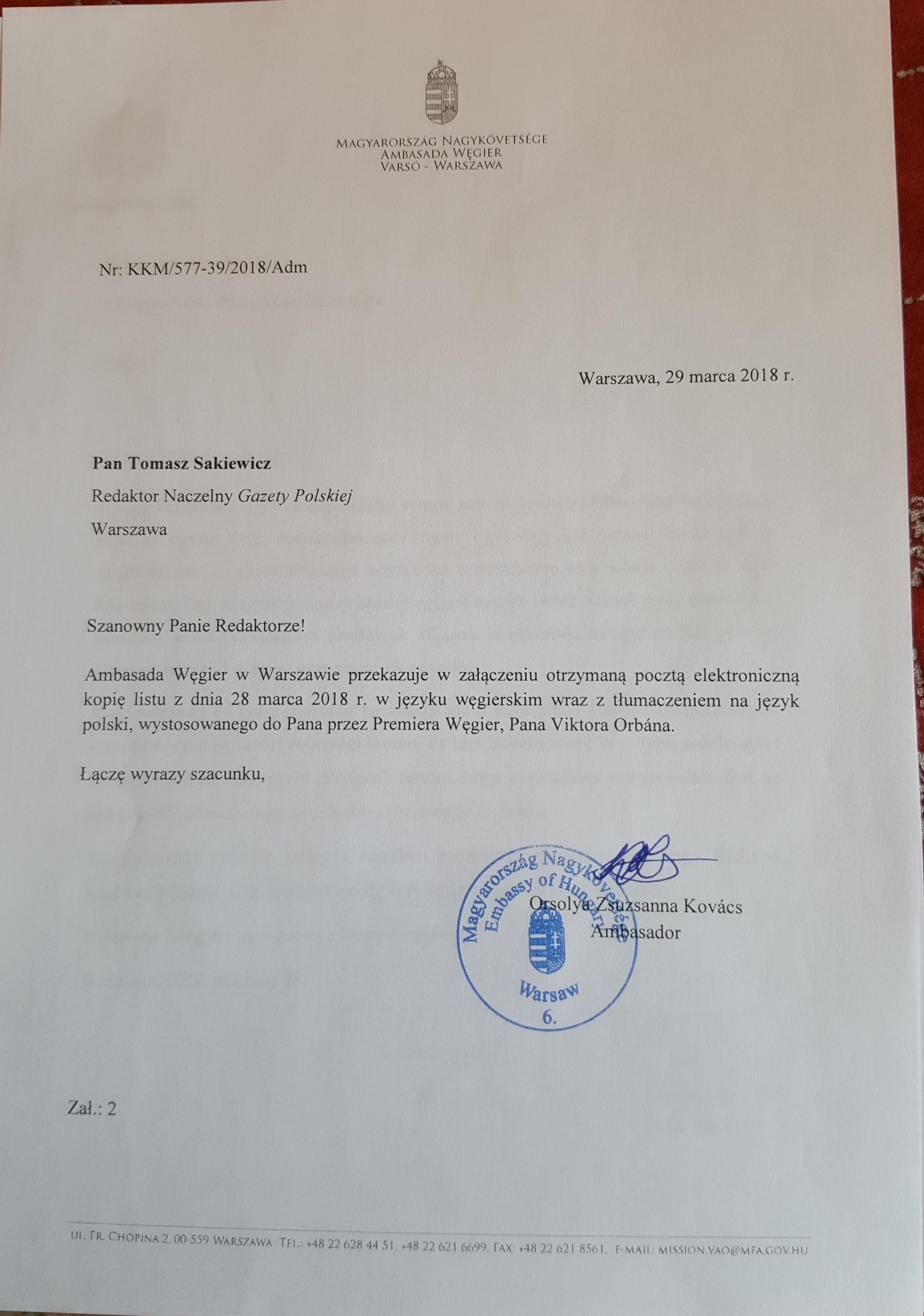 Od tamtych wydarzeń minęły niemal dwa tygodnie, ale nadal są gorąco komentowane. Najlepszym tego przykładem jest, że ambasador Węgier Orsolya Zsuzsanna Kovács spotkała się z redaktorem Tomaszem Sakiewiczem i przekazała listy od premiera Victora Orbana.