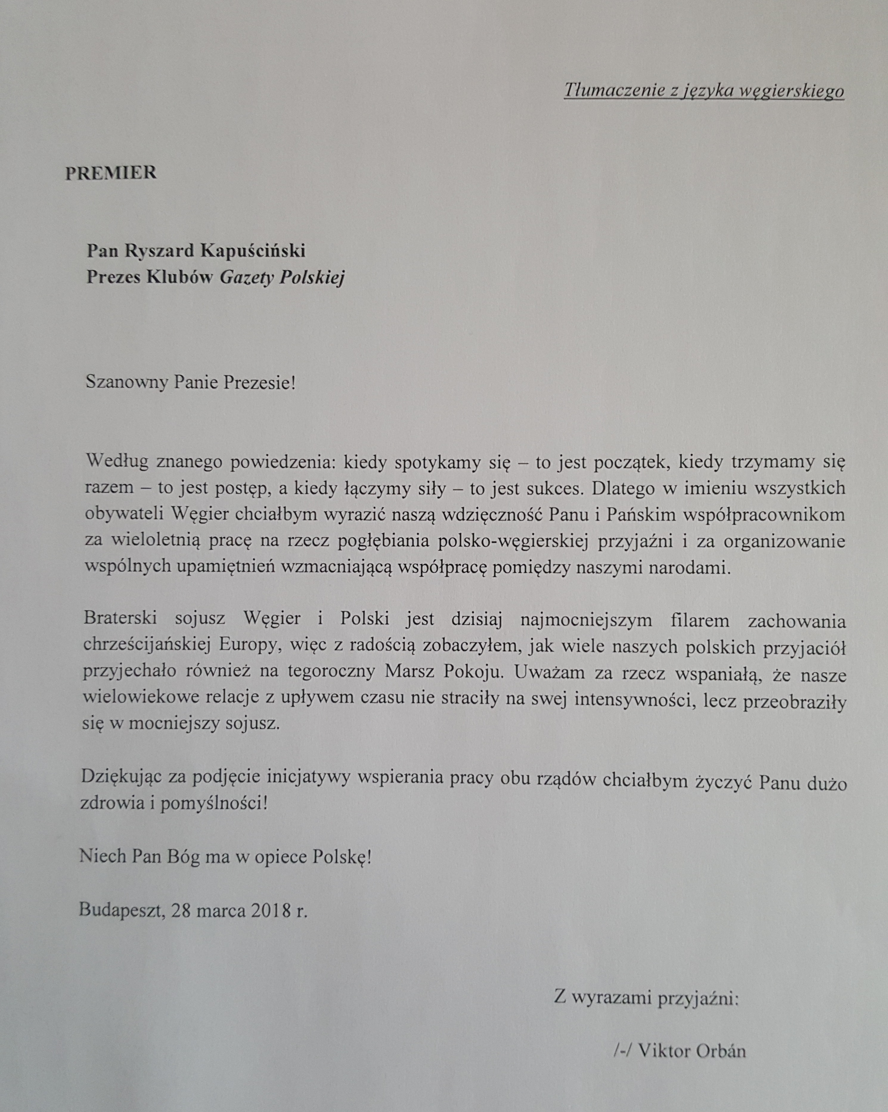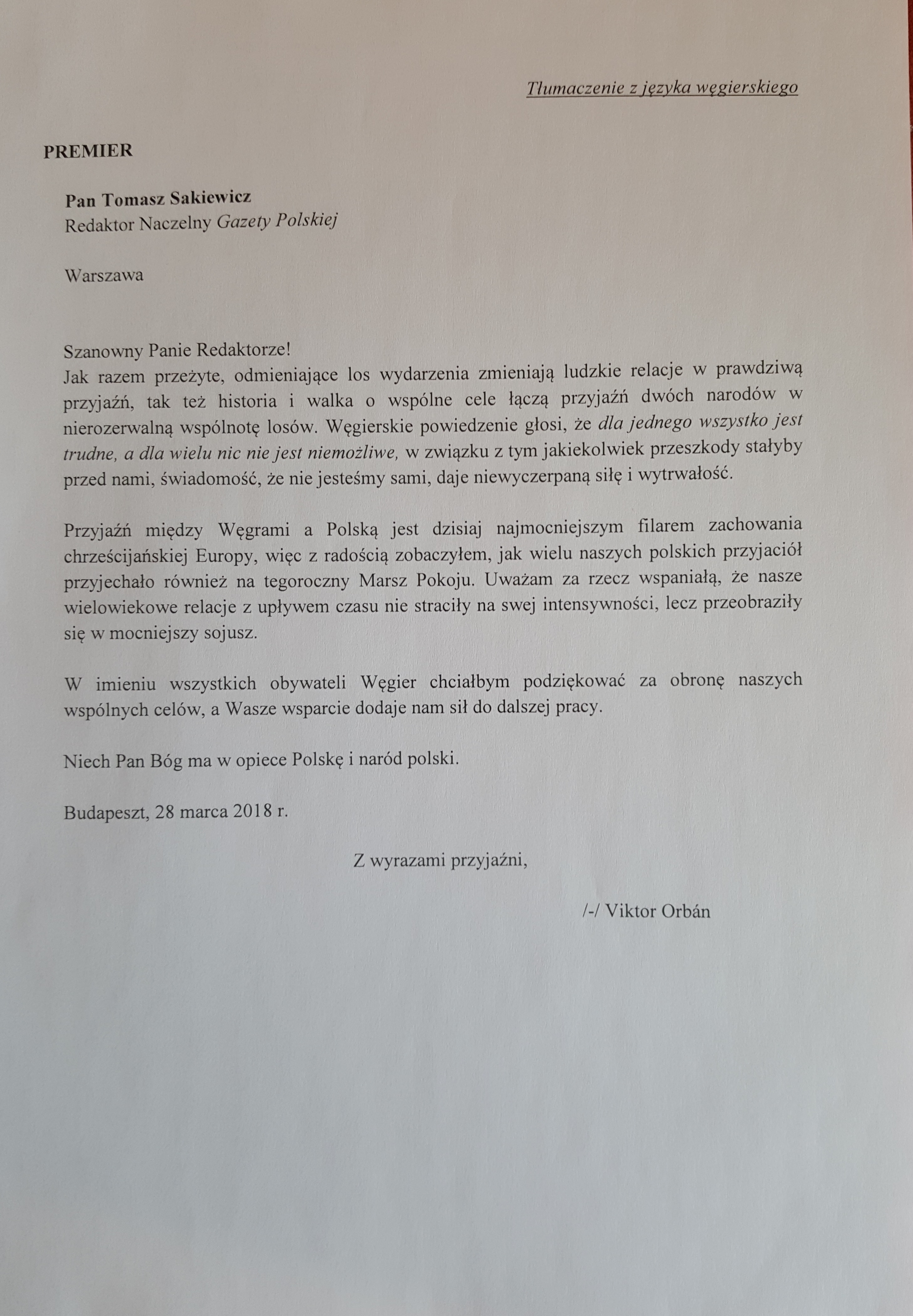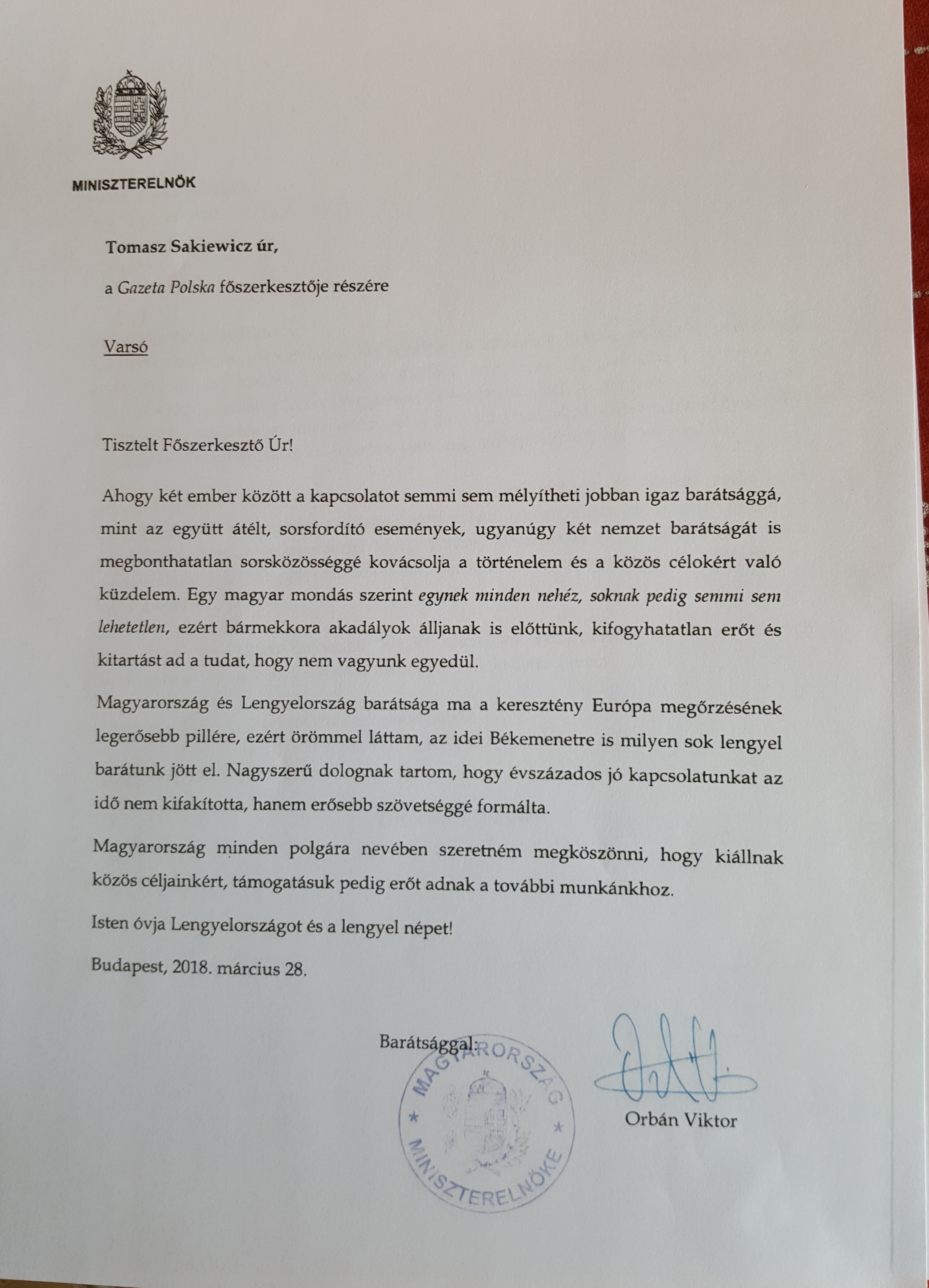 Orban dziękuje Polakom. Specjalne listy do T. Sakiewicza, R. Kapuścińskiego i Klubów „GP”
