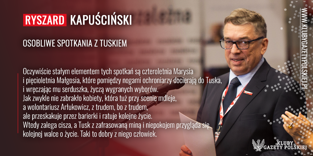 Jak pokazują kolejne spotkania, Donald Tusk jest coraz bardziej osamotniony w swoich kłamstwach i nienawiści do Polski. Najlepszym przykładem było jego ostatnie spotkanie we Wrocławiu. Organizatorzy, przewidując niską frekwencję, w ostatniej chwili przenieśli spotkanie z pl. Wolności, na który zapraszały banery i plakaty na autobusach MPK, na o wiele mniejszy pl. Targowy, tuż obok urzędu miejskiego. Ale nic to nie dało, bo na zdjęciach robionych z góry widać marną frekwencję i nawet sprzyjające portale oceniały liczbę uczestników na niewiele ponad 3 tys. Jednak nie ma się co dziwić, bo ile razy można słuchać kogoś, kto jak zdarta płyta powtarza w kółko: PiS, Kaczyński, Kaczyński, PiS. Oczywiście stałym elementem tych spotkań są czteroletnia Marysia i pięcioletnia Małgosia, które pomiędzy nogami ochroniarzy docierają do Tuska, i wręczając mu serduszka, życzą wygranych wyborów. Jak zwykle nie zabrakło kobiety, która tuż przy scenie mdleje, a wolontariusz Arłukowicz, z trudem, bo z trudem, ale przeskakuje przez barierki i ratuje kolejne życie. Wtedy zalega cisza, a Tusk z zafrasowaną miną i niepokojem przygląda się kolejnej walce o życie. Taki to dobry z niego człowiek.