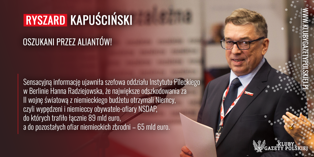 Powinniśmy wykorzystać zainteresowanie światowych mediów informacją, że Polska wystąpi o reparacje wojenne, i przypomnieć światu, jak zostaliśmy oszwabieni przez naszych wojennych sojuszników. Najpierw podczas konferencji jałtańskiej, potem w Poczdamie, kiedy to odsunięto Polskę od otrzymania reparacji, w zamian za to Sowieci mieli Polsce oddać 15 proc. tego, co otrzymają i ukradną. Czarę goryczy przelało porozumienie paryskie z 1946 r. To wówczas alianci podzielili reparacje na dwie kategorie: pieniądze i złoto oraz dobra. To wtedy ustalono, jaki odsetek przejętych dóbr i pieniędzy otrzymają poszczególne państwa. Dostali wszyscy, nawet Unia Afryki Południowej, tylko nie Polska! Sensacyjną informację ujawniła szefowa oddziału Instytutu Pileckiego w Berlinie Hanna Radziejowska, że największe odszkodowania za II wojnę światową z niemieckiego budżetu otrzymali Niemcy, czyli wypędzeni i niemieccy obywate-le-ofiary NSDAP, do których trafiło łącznie 89 mld euro, a do pozostałych ofiar niemieckich zbrodni – 65 mld euro. Musimy świat o tym informować, bo będziemy wielkimi głupcami, jeśli w kontekście naszego wystąpienia o reparacje nie przypomnimy, jak zostaliśmy wcześniej oszukani przez sojuszników!