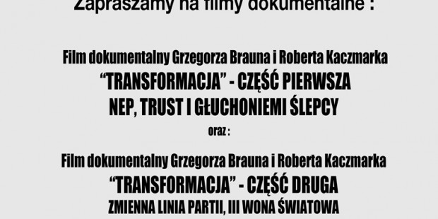 Ottawa – Wieczór Filmowy, projekcja filmów „Transformacja” cz.I i cz. II, 26 kwietnia, g. 7 PM, Ottawa – Wieczór Filmowy, projekcja filmów „Transformacja” cz.I i cz. II, 26 kwietnia, g. 7 PM, Heron Road Community Center, 1480 Heron RD, ON K1V 6A5. kw. 16, 2014 Kluby GP Ottawa (Ontario) Tagged Grzegorz Braun, Ottawa (Ontario), projekcja, Robert Kaczmarek Wstecz W hołdzie Ofiarom tragedii smoleńskiej – Houston Dalej Upamiętnienie Ofiar tragedii smoleńskiej w Londynie.