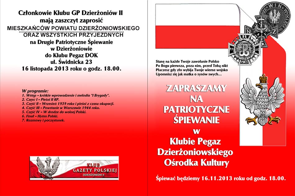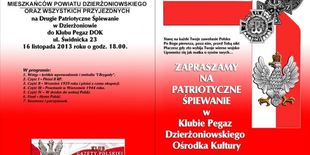 Zapraszamy na Patriotyczne Śpiewanie II – 16.11.2013. od godz. 18.00 do 20.00 do Klubu „Pegaz” DOK ul. Świdnicka 23 w Dzierżoniowie.