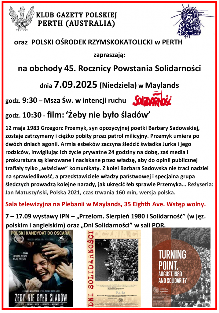 • godz. 10:30 – film „Żeby nie było śladów”, wystawy IPN „Przełom. Sierpień 1980 i Solidarność” w jęz. polskim i angielskim