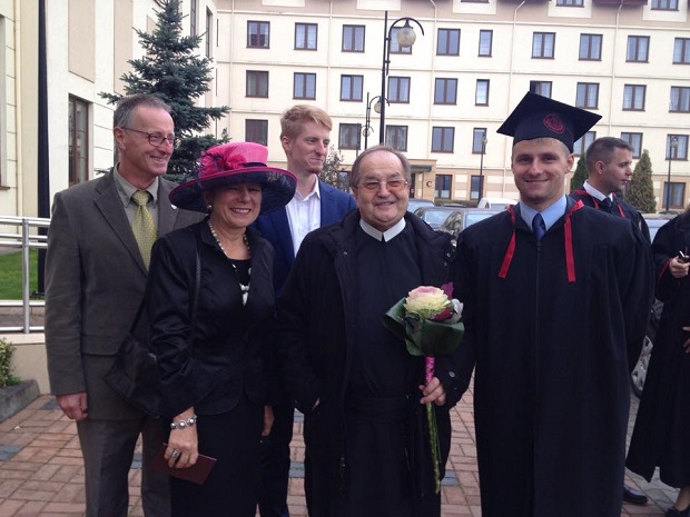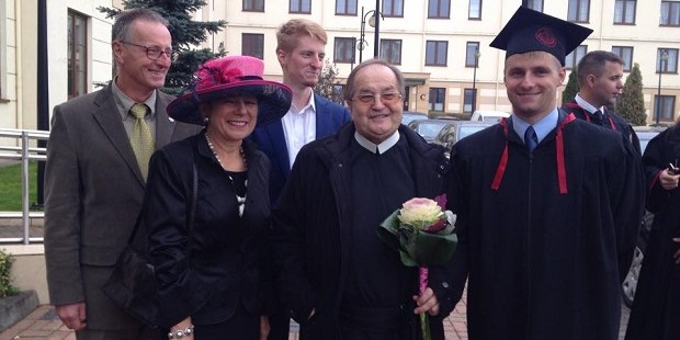 Członkowie Klubu GP Krzywiń z pierwszym absolwentem z Krzywinia toruńskiej WSKSiM oraz obecnym jej studentem. Na zdjęciu obecny także założyciel Radia Maryja i dzieł przy nim powstałych. Pierwszy rektor WSKSiM.