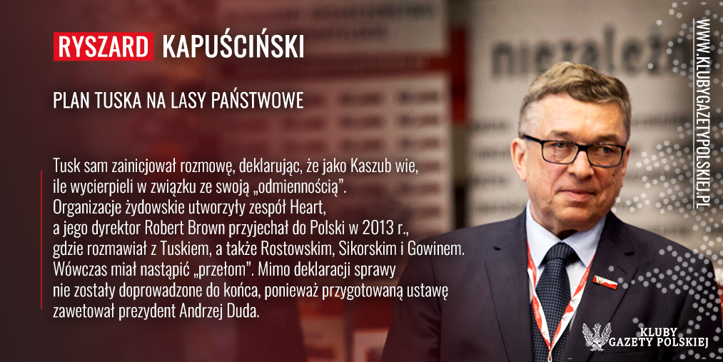 Jak rząd PO-PSL w latach 2008−2015 wyprzedawał akcje i udziały aż w 950 spółkach skarbu państwa, tylko za 58 mld zł, to pamiętamy. To, że głodowe pensje wypędzały miliony Polaków do pracy w Niemczech, gdzie za parę euro byli wykorzystywani, też pamiętamy. Jednak warto przypomnieć, co zamierzano zrobić z Lasami Państwowymi. W 2014 r. na portalu WikiLeaks ujawniono depeszę amerykańskiego ambasadora Victora H. Ashe, która potwierdza, że prezydent Bronisław Komorowski i premier Donald Tusk złożyli obietnicę zwrotu odszkodowania Żydom za mienie odebrane im przez Niemców i Sowietów, a pieniądze planowali zdobyć m.in. dzięki sprzedaży ziemi i lasów. Pomysł pojawił się w 2008 r. podczas spotkania z przedstawicielami organizacji żydowskich w Nowym Jorku. Tusk sam zainicjował rozmowę, deklarując, że jako Kaszub wie, ile wycierpieli w związku ze swoją „odmiennością”. Organizacje żydowskie utworzyły zespół Heart, a jego dyrektor Robert Brown przyjechał do Polski w 2013 r., gdzie rozmawiał z Tuskiem, a także Rostowskim, Sikorskim i Gowinem. Wówczas miał nastąpić „przełom”. Mimo deklaracji sprawy nie zostały doprowadzone do końca, ponieważ przygotowaną ustawę zawetował prezydent Andrzej Duda.