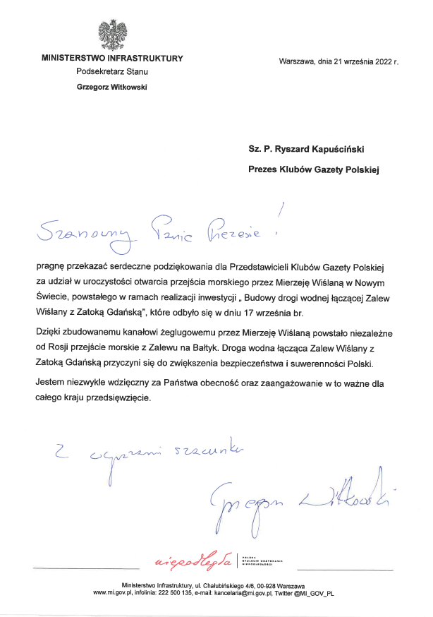 pragnę przekazać serdeczne podziękowania dla Przedstawicieli Klubów Gazety Polskiej za udział w uroczystości otwarcia przejścia morskiego przez Mierzeję Wiślaną w Nowym Świecie, powstałego w ramach realizacji inwestycji „ Budowy drogi wodnej łączącej Zalew Wiślany z Zatoką Gdańską”, które odbyło się w dniu 17 września br.