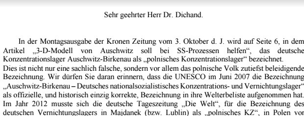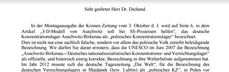 In der Montagsausgabe der Kronen Zeitung vom 3. Oktober d. J. wird auf Seite 6, in dem Artikel „3-D-Modell von Auschwitz soll bei SS-Prozessen helfen“, das deutsche Konzentrationslager Auschwitz-Birkenau als „polnisches Konzentrationslager“ bezeichnet.