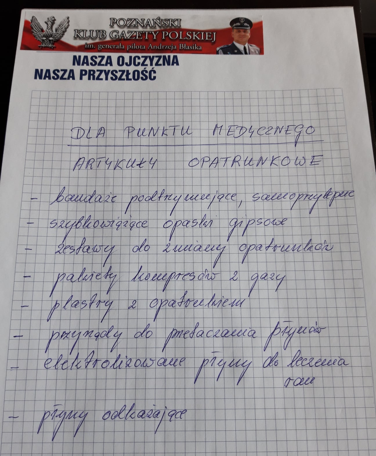 Poznański Klub Gazety Polskiej szeroko angażuje się w pomoc, uciekającym przed wojną do naszego kraju, Sąsiadom. Uczestniczymy w różnych akcjach, zbierając potrzebne uchodźcom rzeczy. Nasi wolontariusze niosą pomoc w punktach przyjęć, donosząc kanapki na dworzec dla przybywających do Poznania. Wspólnie z naszymi przyjaciółmi, za zebrane środki finansowe, postanowiliśmy wesprzeć punkt medyczny lub szpital na Ukrainie i zakupiliśmy rożne materiały medyczne. Zostały one złożone w biurze posła Bartłomieja Wróblewskiego, skąd z innymi rzeczami, powędrują bezpośrednio do walczącej Ukrainy.