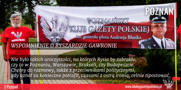 RYSZARD GAWRON – dla nas członków Klubów Gazety Polskiej – nie tylko w Poznaniu, ale i innych miejscach Polski, a także poza nią, po prostu Rysiu. Kolega zawsze miły, uśmiechnięty, każdemu życzliwy i pomocny. Zawsze gotowy do poświęceń dla Ojczyzny. Na niemal wszystkich uroczystościach trzymał flagę Bóg, Honor, Ojczyzna, albo nasz baner klubowy, albo flagę narodową. Nie było takich uroczystości, na których Rysia by zabrakło, czy to w Poznaniu, Warszawie, Brukseli, czy Budapeszcie. Chętny do rozmowy, także z przeciwnikami politycznymi, gdy uznał za konieczne potrafił, czasami z ostrą ironią, celnie ripostować.