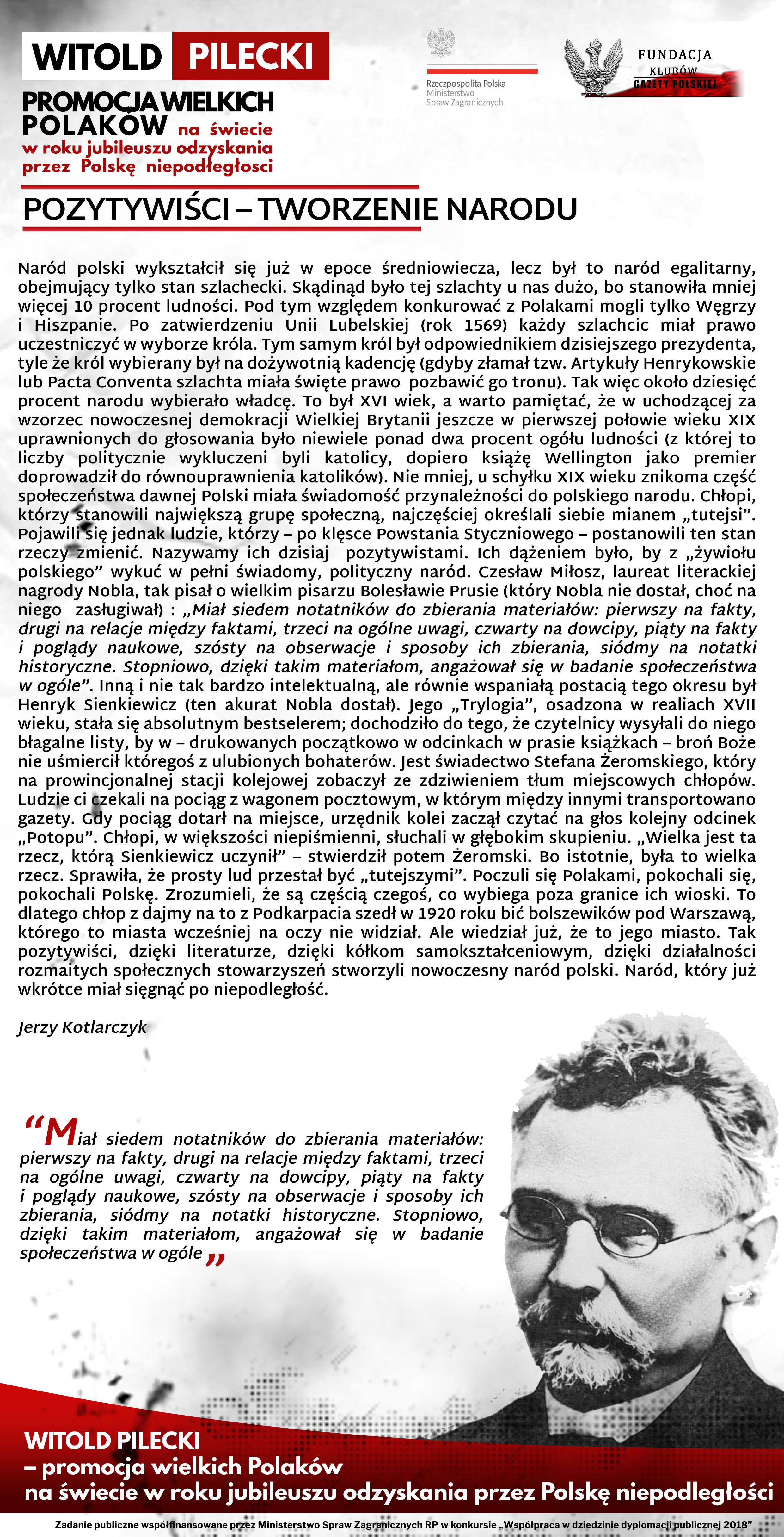 Naród polski wykształcił się już w epoce średniowiecza, lecz był to naród egalitarny, obejmujący tylko stan szlachecki. Skądinąd było tej szlachty u nas dużo, bo stanowiła mniej więcej 10 procent ludności. Pod tym względem konkurować z Polakami mogli tylko Węgrzy i Hiszpanie. Po zatwierdzeniu Unii Lubelskiej (rok 1569) każdy szlachcic miał prawo uczestniczyć w wyborze króla. Tym samym król był odpowiednikiem dzisiejszego prezydenta, tyle że król wybierany był na dożywotnią kadencję (gdyby złamał tzw. Artykuły Henrykowskie lub Pacta Conventa szlachta miała święte prawo pozbawić go tronu). Tak więc około dziesięć procent narodu wybierało władcę. To był XVI wiek, a warto pamiętać, że w uchodzącej za wzorzec nowoczesnej demokracji Wielkiej Brytanii jeszcze w pierwszej połowie wieku XIX uprawnionych do głosowania było niewiele ponad dwa procent ogółu ludności (z której to liczby politycznie wykluczeni byli katolicy, dopiero książę Wellington jako premier doprowadził do równouprawnienia katolików). Nie mniej, u schyłku XIX wieku znikoma część społeczeństwa dawnej Polski miała świadomość przynależności do polskiego narodu. Chłopi, którzy stanowili największą grupę społeczną, najczęściej określali siebie mianem „tutejsi”. Pojawili się jednak ludzie, którzy – po klęsce Powstania Styczniowego – postanowili ten stan rzeczy zmienić. Nazywamy ich dzisiaj pozytywistami. Ich dążeniem było, by z „żywiołu polskiego” wykuć w pełni świadomy, polityczny naród. Czesław Miłosz, laureat literackiej nagrody Nobla, tak pisał o wielkim pisarzu Bolesławie Prusie (który Nobla nie dostał, choć na niego zasługiwał) : „Miał siedem notatników do zbierania materiałów: pierwszy na fakty, drugi na relacje między faktami, trzeci na ogólne uwagi, czwarty na dowcipy, piąty na fakty i poglądy naukowe, szósty na obserwacje i sposoby ich zbierania, siódmy na notatki historyczne. Stopniowo, dzięki takim materiałom, angażował się w badanie społeczeństwa w ogóle”. Inną i nie tak bardzo intelektualną, ale równie wspaniałą postacią tego okresu był Henryk Sienkiewicz (ten akurat Nobla dostał). Jego „Trylogia”, osadzona w realiach XVII wieku, stała się absolutnym bestselerem; dochodziło do tego, że czytelnicy wysyłali do niego błagalne listy, by w – drukowanych początkowo w odcinkach w prasie książkach – broń Boże nie uśmiercił któregoś z ulubionych bohaterów. Jest świadectwo Stefana Żeromskiego, który na prowincjonalnej stacji kolejowej zobaczył ze zdziwieniem tłum miejscowych chłopów. Ludzie ci czekali na pociąg z wagonem pocztowym, w którym między innymi transportowano gazety. Gdy pociąg dotarł na miejsce, urzędnik kolei zaczął czytać na głos kolejny odcinek „Potopu”. Chłopi, w większości niepiśmienni, słuchali w głębokim skupieniu. „Wielka jest ta rzecz, którą Sienkiewicz uczynił” – stwierdził potem Żeromski. Bo istotnie, była to wielka rzecz. Sprawiła, że prosty lud przestał być „tutejszymi”. Poczuli się Polakami, pokochali się, pokochali Polskę. Zrozumieli, że są częścią czegoś, co wybiega poza granice ich wioski. To dlatego chłop z dajmy na to z Podkarpacia szedł w 1920 roku bić bolszewików pod Warszawą, którego to miasta wcześniej na oczy nie widział. Ale wiedział już, że to jego miasto. Tak pozytywiści, dzięki literaturze, dzięki kółkom samokształceniowym, dzięki działalności rozmaitych społecznych stowarzyszeń stworzyli nowoczesny naród polski. Naród, który już wkrótce miał sięgnąć po niepodległość.