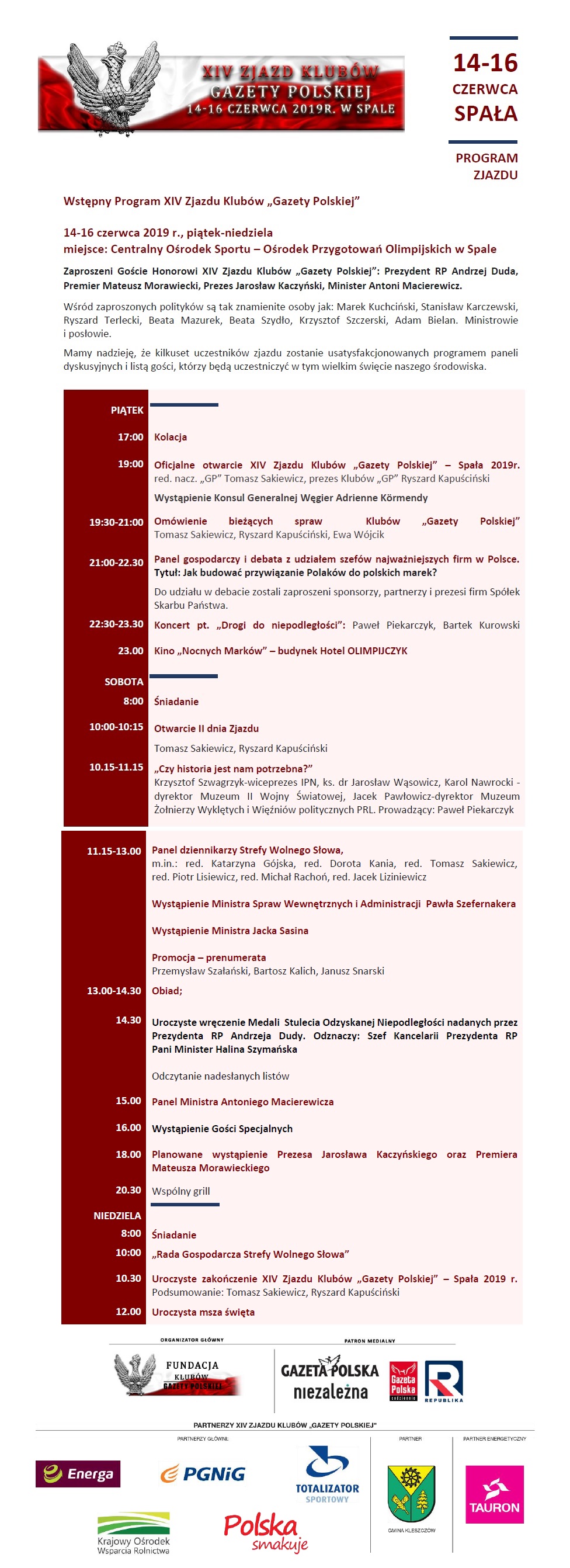 PROGRAM XIV Zjazdu Klubów „Gazety Polskiej” 14-16 czerwca Spała 2019r.