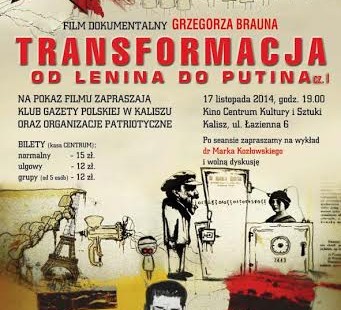 Projekcja filmu G. Brauna pt. „Transformacja” – 17 listopada Kaliski Klub Gazety Polskiej zaprasza 17 listopada (poniedziałek) na godz. 19:00 do kina „CENTRUM” na film Grzegorza Brauna pt.”TRANSFORMACJA”. lis 14, 2014 Kluby GP Kalisz Tagged Grzegorz Braun, Kalisz Wstecz Kalisz – (zmiana terminu) spotkania w każdy ostatni wtorek miesiąca o g. 18 Dalej Poznań – otwarcie wystawy Pułkownik Ryszard Kukliński Polska Samotna Misja, 17 listopada.