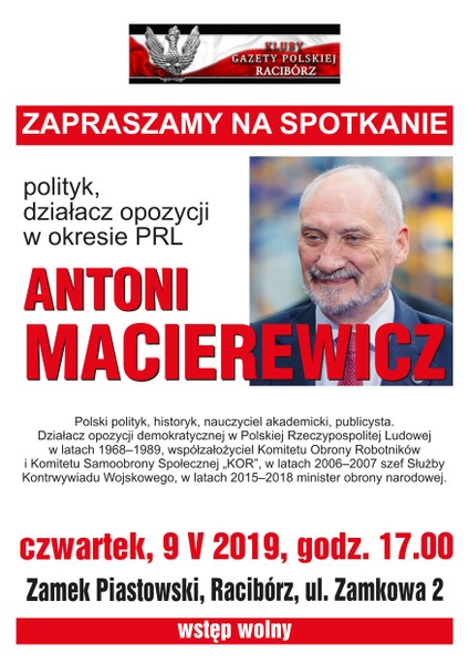 RACIBÓRZ – SPOTKANIE ODWOŁANE spotkanie z posłem na Sejm RP, Antonim Macierewiczem, 9 maja, g. 17, na Zamku Piastowskim w Raciborzu, ul. Zamkowa 2. Zapowiedziane na 9. maja 2019 spotkanie z Panem Posłem na Sejm RP, Antonim Macierewiczem, zostało przełożone z powodu zajęć związanych z pełnieniem funkcji posła. Serdecznie przepraszamy osoby zainteresowane. Klub Gazety Polskiej w Raciborzu.